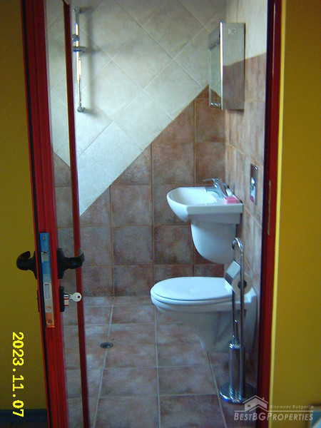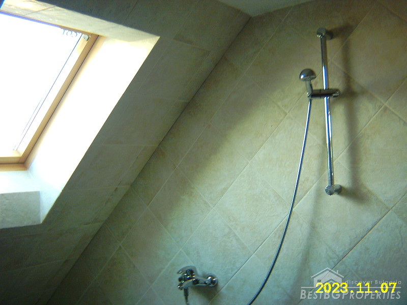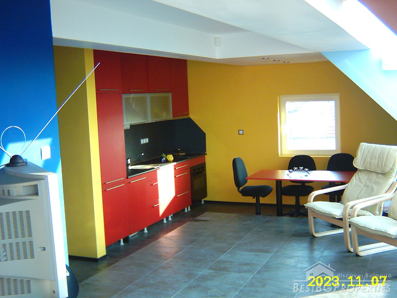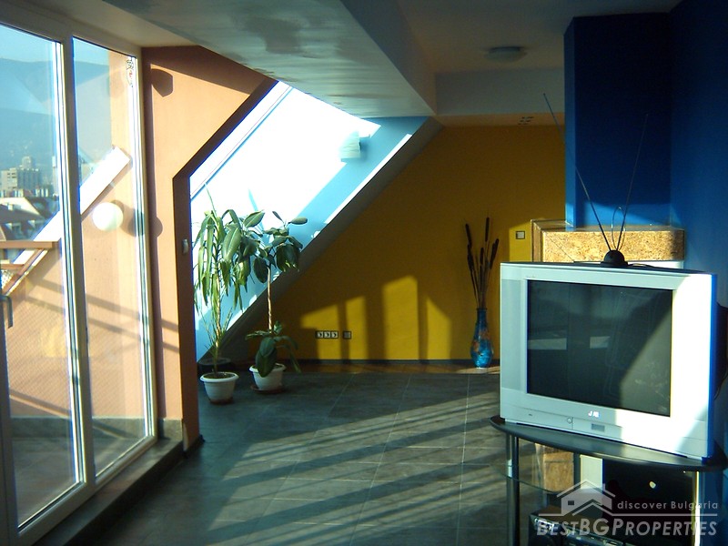The apartment is situated in a newly built residential building on the Tsar Boris Boulevard. The building is finished in year 2005 and it is built according to the highest requirements of modern construction. The apartment is situated on the last - seventh floor of the building. It is one bedroom type comprising total living area of whole - 90 sq m. The living area is distributed between a lounge with fitted wardrobe, very spacious living room with view over the Vitosha Mountain. The living room is around 50 sq m large and includes a kitchen box, dining area, resting area with fireplace, a working space and a sleeping area. Separately there is another room, a balcony with south-east view, and a bathroom with a panoramic window.