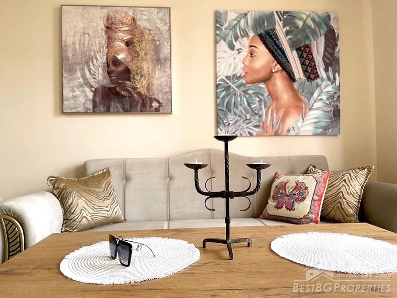The apartment is light and spacious, designed, furnished and equipped with high class furniture and appliances. The property has the following functional distribution inside: a living room with kitchenette and an exit to a balcony, a bathroom with toilet and one bedroom. Everything is included in the sale - dishwasher, ceramic hob, stove, refrigerator, freezer, washing machine.