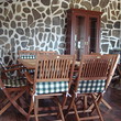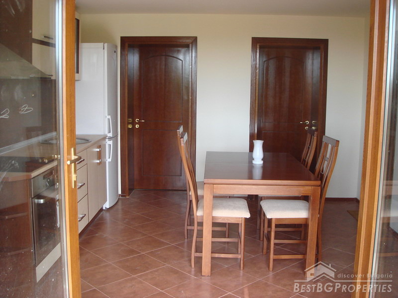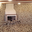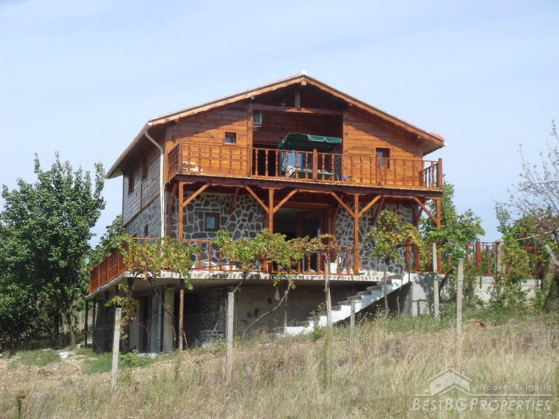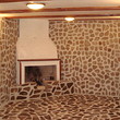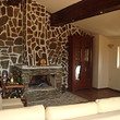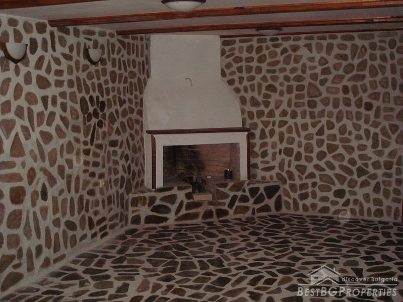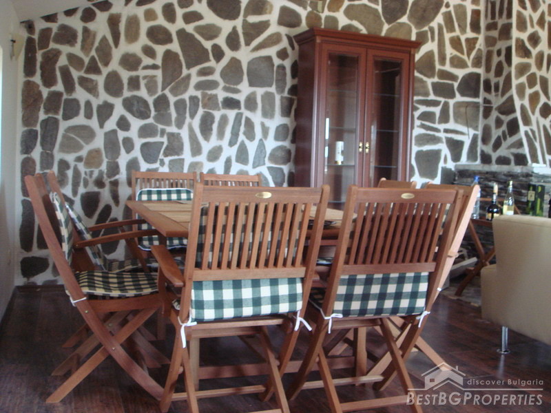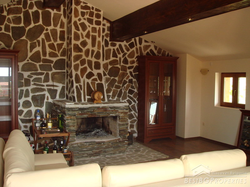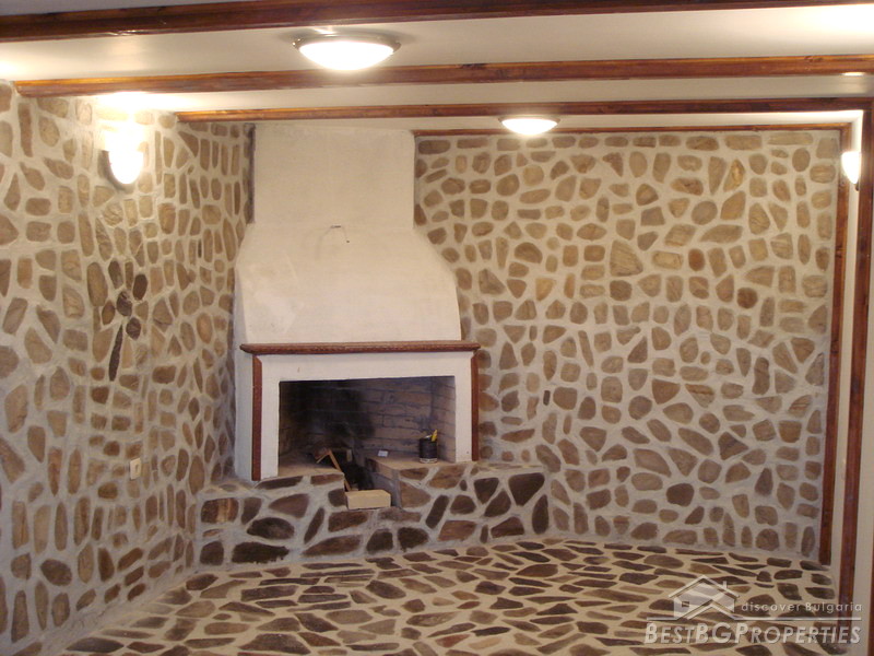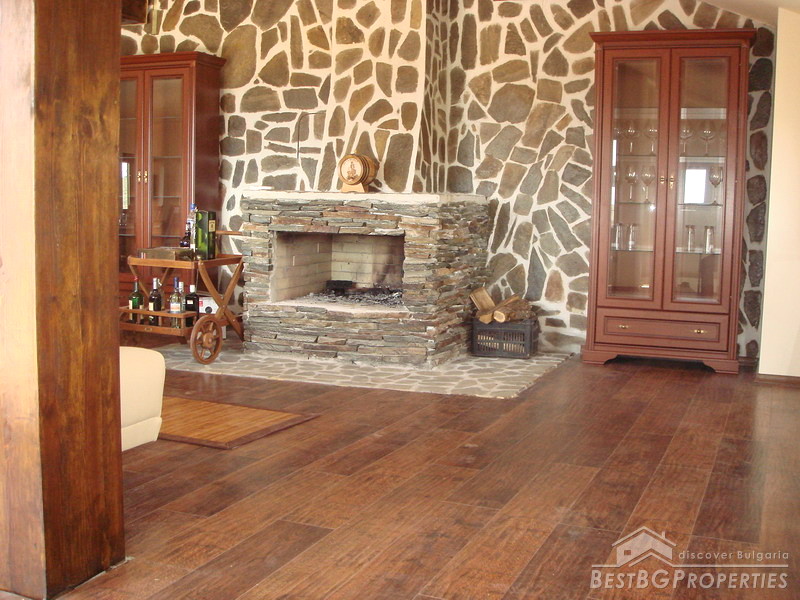 On the first floor there is a kitchen and a dining area and two bedrooms - each with a bathroom . A spiral staircase is leading to the second floor where there is a big living space , nicely arranged for pleasant evenings and friendly meetings . The area has a big fireplace , built of stone . The whole premise is arranged in wood and stone style giving you a special feeling of comfort and relax. The room is furnished with big L shape sofa , facing the fireplace , and a glass table in front of it . A place for dinners is forseen in the left part of the room - a big table with 8 chairs gives enough space even for a big family gatherings. The shape of the room adds to its charm . The room has its own bathroom and toilet also.