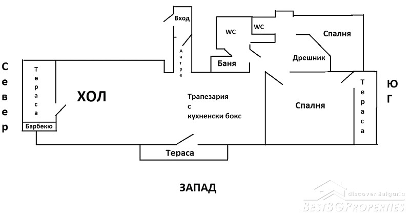 The property consists of 2 bedrooms (one with a terrace), a kitchen with a terrace, a dining room + a living room also with an exit to the terrace (with a built-in barbecue), a bathroom with a toilet and a separate toilet. There is a space between the two bedrooms, which can be converted into a closet.