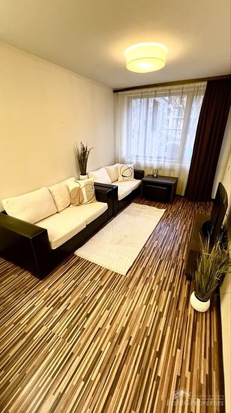 The apartment is located on the first floor and is fully furnished and after a refreshing renovation. Its total living area is of 55.32 sq m. The apartment is west facing and consists of a hallway, spacious living room with coffee table, bar counter with dining chairs, TV, equipped kitchen, microwave oven, large bedroom and a bathroom with bathtub and toilet.
