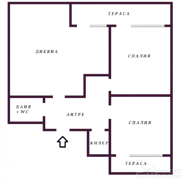 The apartment faces southeast. It consists of a corridor, a laundry room, a bathroom and toilet, a living room with kitchenette, two bedrooms and two terraces. The total living area is 74 sq m.