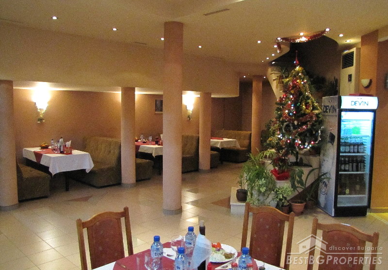 The hotel benefits with a restaurant with 70 indoor seats and 40 open air. The swimming pool is 1.45 meters deep, heated. There is also fitness, spa center – unfinished, lobby bar and an office. The building has its own video surveillance and alarm systems.