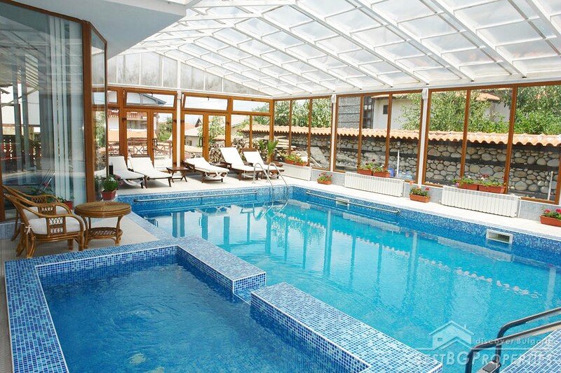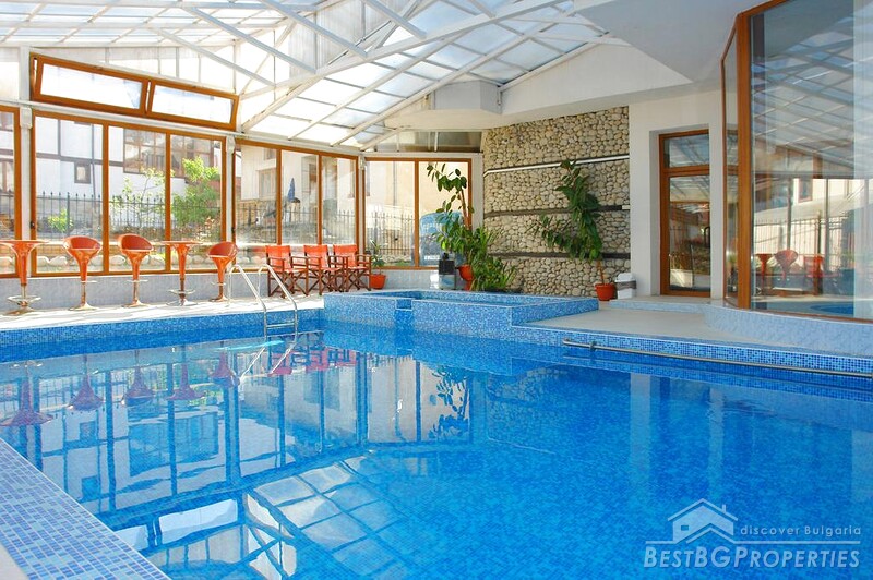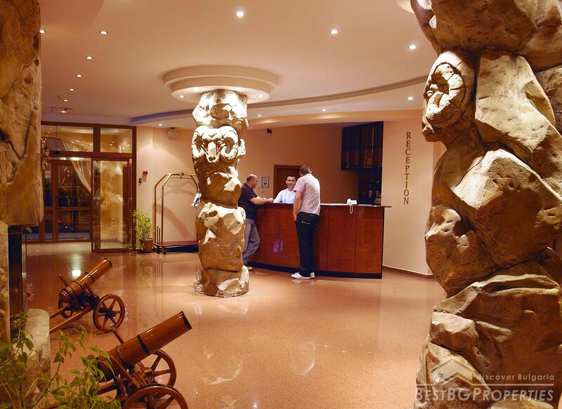 The hotel has a total area of 2,500 sq m and sits on a plot of land of 920 sq m. It offers 30 rooms with a total capacity of 78 beds, excluding additional children’s beds. Guests enjoy a full range of amenities including a swimming pool with a glass roof, sauna, jacuzzi, fitness area, massage room, ski storage, restaurant, bar, and parking. The restaurant, designed in traditional Bulgarian Mehana style, accommodates up to 80 guests and has its own street entrance, while the lobby bar offers a relaxed setting for up to 30 people.
