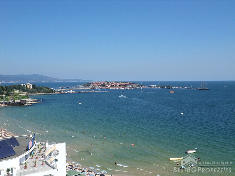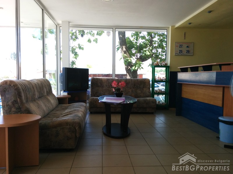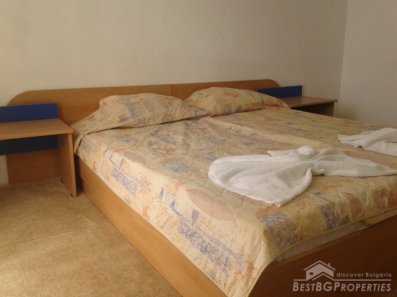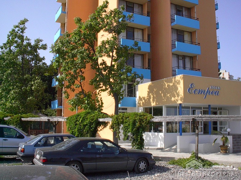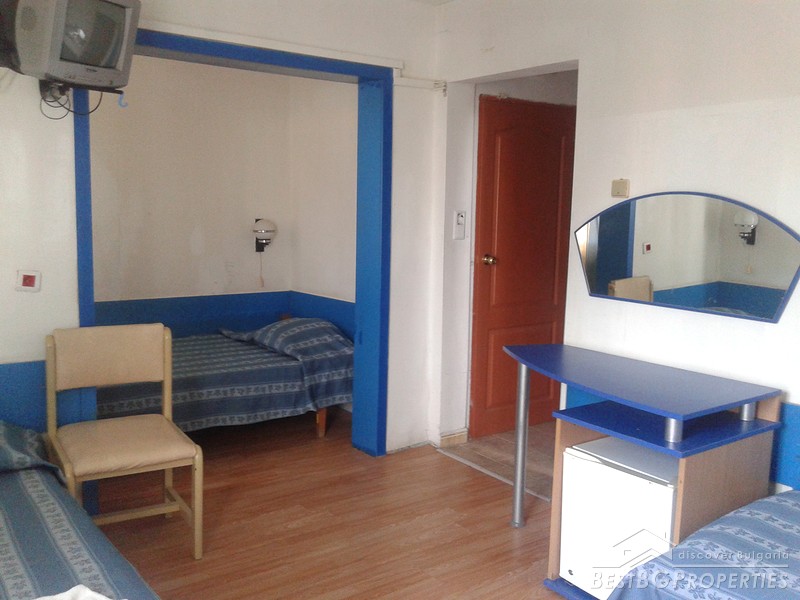 The hotel is located on the southern beach of one of Bulgaria's most beautiful Black sea towns, Nessebar. It is only 10 meters away from the beach strip of the southern beach. The hotel comprises with 91 rooms and 2 apartments, two elevators and reception. It offers rooms with 2, 3 or four beds. Each room has stretching sofa which can be used as a bed, separate sanitary premise, small fridge and TVs. There are balconies with wonderful views of the sea, the Old part of Nessebar and Ravda. The hotel also has a restaurant for 100 seats and a balcony with 30 more seats.