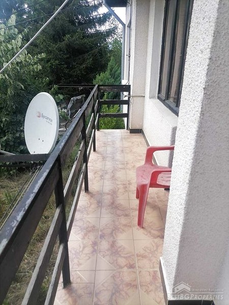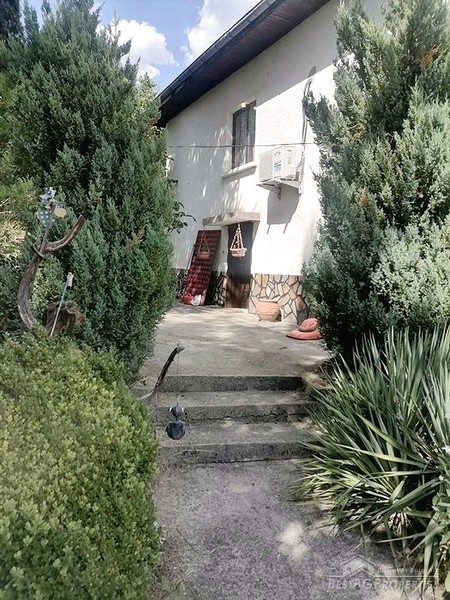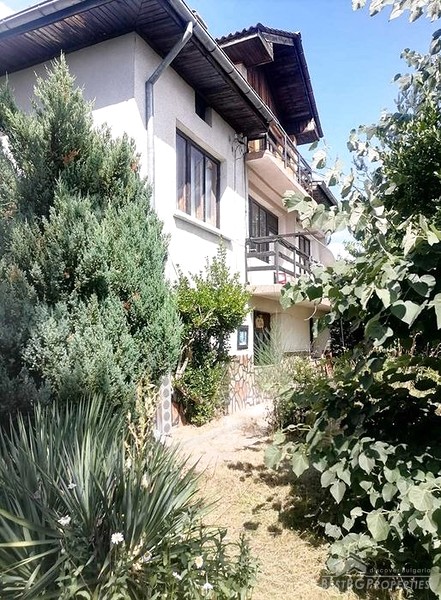 The plot is terraced and split on different areas - barbecue area and fruit garden area (apricots, apple, cherry, and grapes). There is also recreation area with a beautiful fountain with a waterfall wall, tables, garden sculptures, plum trees, hazelnuts, lilacs, etc. Pine trees are planted everywhere and the air is crystal clear. In the back yard there is a garage and a log cabin. The property is surrounded by a stable fence.