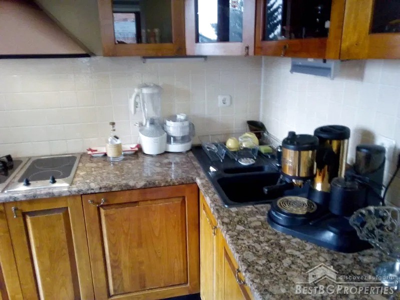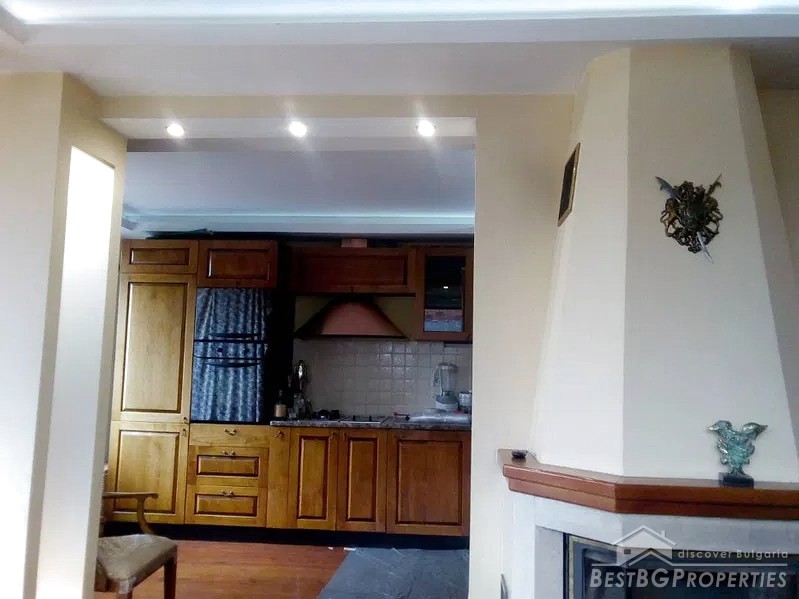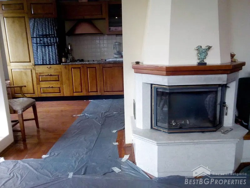 First level - spacious living room with dining area and kitchenette and a toilet. The floors here are made of natural wood and terracotta. The living room opens onto a large sunny terrace overlooking the Rila Mountains.