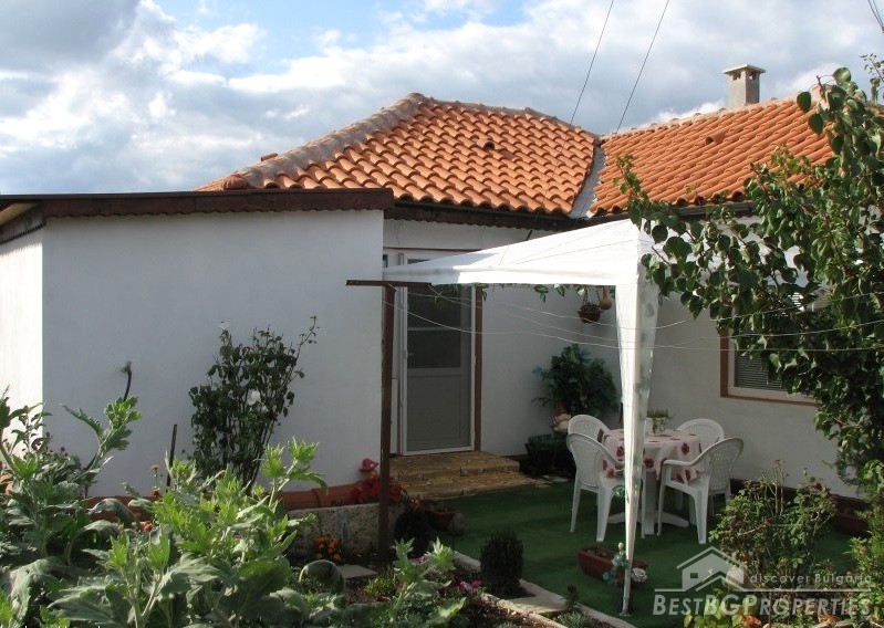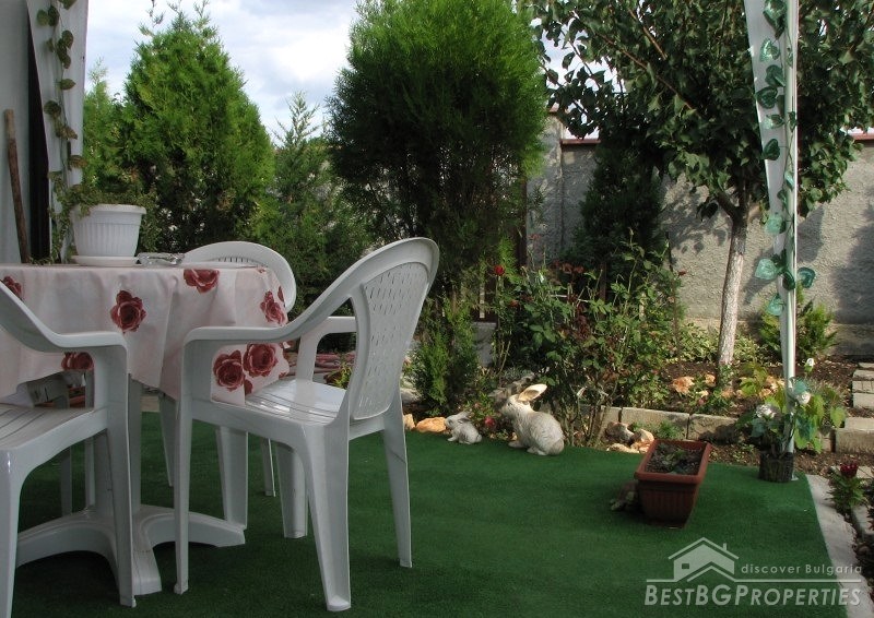 The offered property consists of a single storied, renovated house, three newly built garages and a fruit garden. The house has total living area of 75 sq m. The living area is distributed between a corridor, bathroom with WC, and three rooms. The house has fully renovated roof, renewed PVC window joineries. Outside there are three garages with total area of 70 sq m. The property sits on a spacious, leveled plot of land with size 800 sq m. In the yard there is a beautiful garden with over 22 fruit trees. The whole property is surrounded with a massive fence.