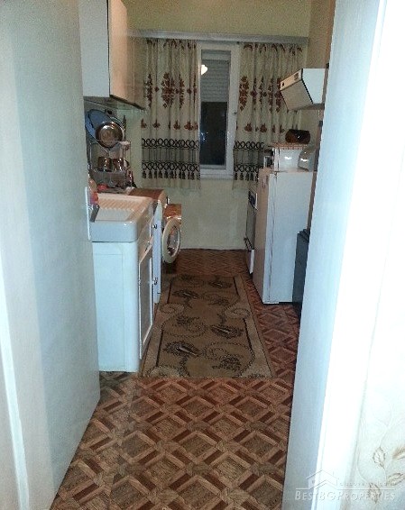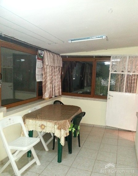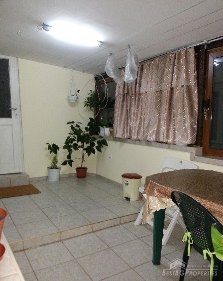 The house has total living area of 75 sq m, on two floors. On the upper floor there are two bedrooms, kitchen, L-shaped hallway with wooden flooring, bathroom with WC and a large glazed terrace. There are solar panels on the roof. Two of the rooms have windows with shutters. Downstairs there are another two rooms, a sink in the corridor and a closet. The rooms are furnished.