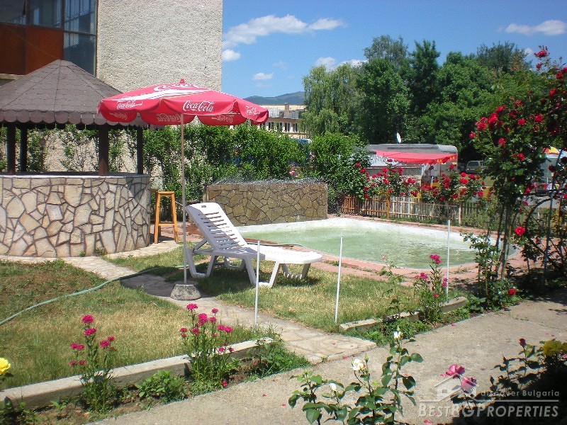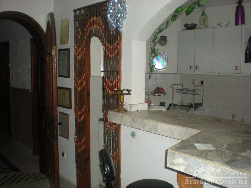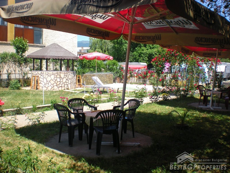 The house is located 100 meters from the stadium and the new store Bagheera - very convenient area for business development. The building consists of three floors - each with living area 100 sq m. One of the floors is residential and the rest are developed as a workshop and a sweet shop. The property comes with a yard - 260 sq m. The house is newly built, finished with terracotta and aluminum window joineries. The residential part comprises with a sauna. There are bathrooms and toilets on each floor, two fireplaces, own water supply. The whole house is supplied with water and many other extras. There is an outdoor garden with many flowers - roses, open air swimming pool and two fountains. There is new external toilet.