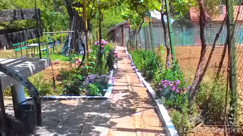 The size of the plot is 546 sq m. It includes a fruit garden with 14 fruit trees, vines, concrete pit for irrigation water with capacity of 48 cubic meters and few additional small outbuildings.