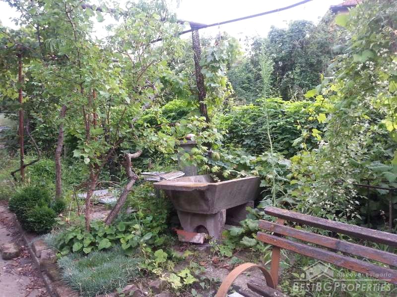 The floors have wood covers everywhere and the window joiners are wooden as well. The house has a garage, yard with vineyards and trees. The heating is on electricity and solid fuel.