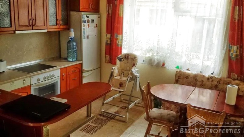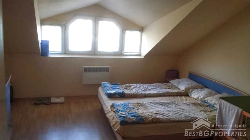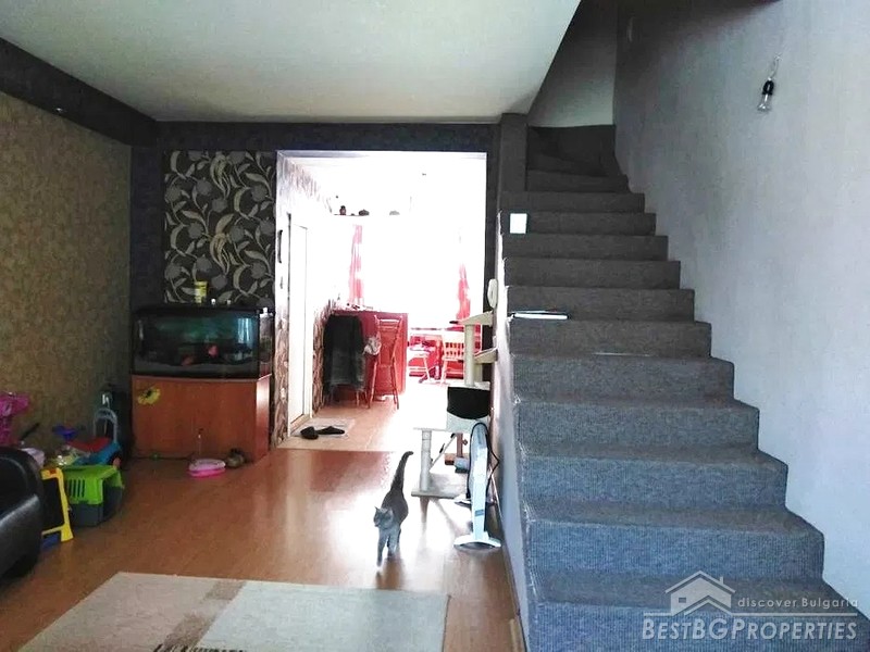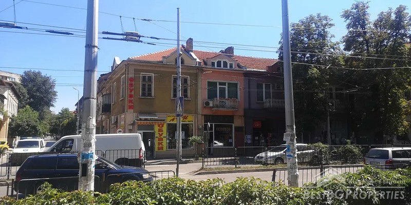 The house has a total living area of 96 sq m. It is facing a main asphalted street, has southeast exposure. The building was renovated. Its clean living area is 96 sq m. It has tweo residential floors and a ground floor. On the ground floor there is a shop. The residential part of the house consists of living room, 2 bedrooms, 2 bathrooms, and a terrace.