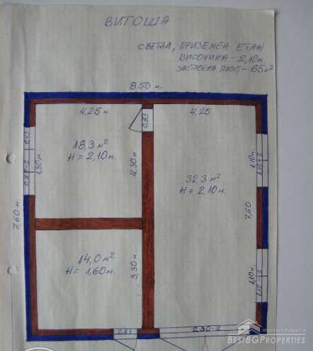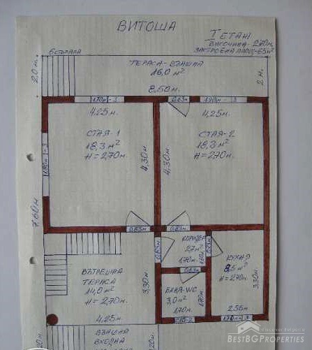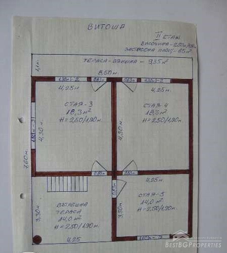 The total living area of the house is 200 square meters. The first floor is half underground but very bright, consists of 3 premises with dimensions - 32.3 square meters, 18.3 square meters and 14.0 square, meters. The second level comprises of a living room, dining room, kitchen, bathroom with toilet and a large terrace with wonderful views to the city. The third level has 3 bedrooms and a large terrace with wonderful panoramic views of Sofia.