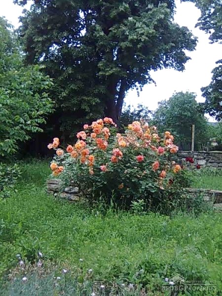 The parcel is mostly flat with a slight slope at one of its corners. On it, there is a house, 2 fountains, several large walnut trees, fruit trees (apples, apricots, peaches, plums, sour cherries, lindens, quince, mulberries, quince, plums) and a farm building.