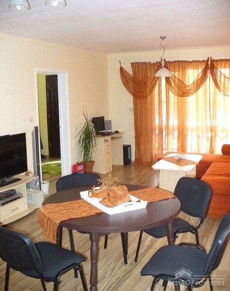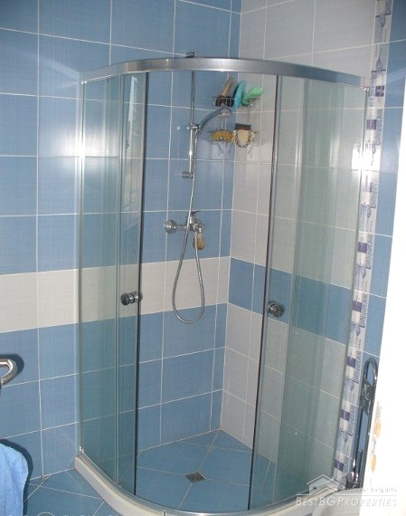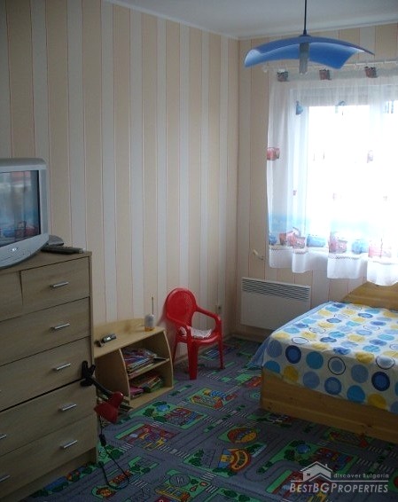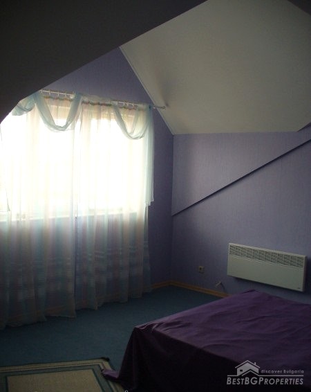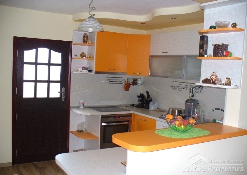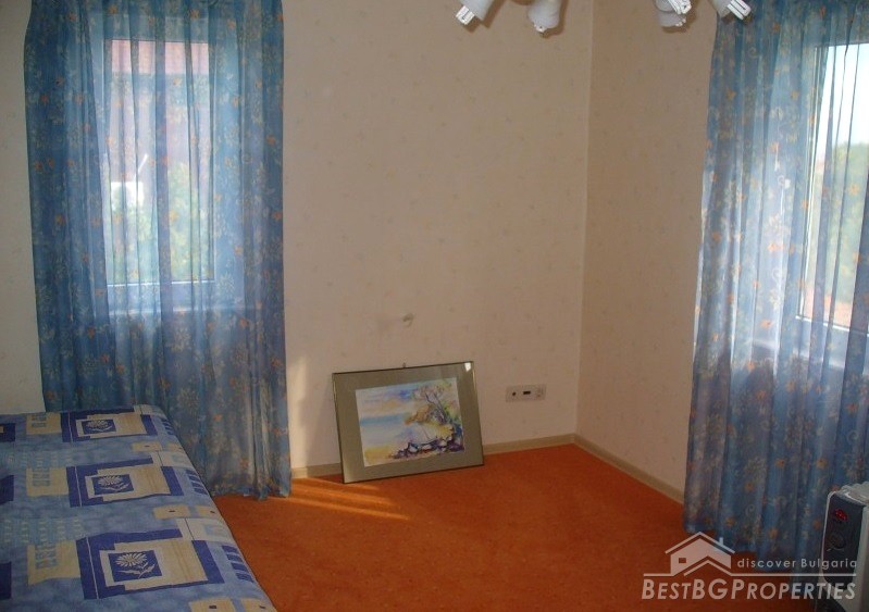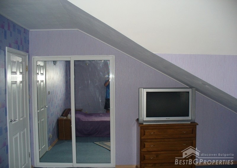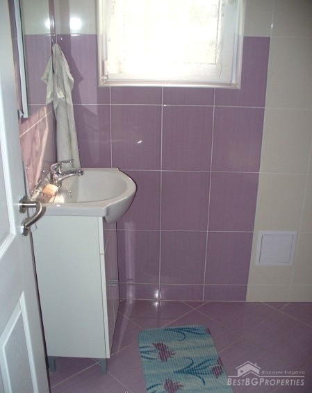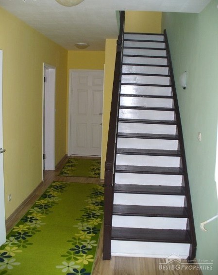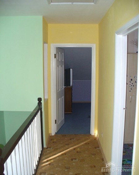 The first floor is finished with laminate floorings in the hallway, living room and kitchen. The bathroom is fully equipped. The service premises are finished with carpet floors. On the second floor there are carpet floors and fully equipped bathroom with shower cabin. The windows are PVC double glazing. The heating is via electric convectors and air conditioning. There is a possibility for central heating. A 120 liter boiler with solar panels is placed on the attic.