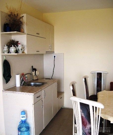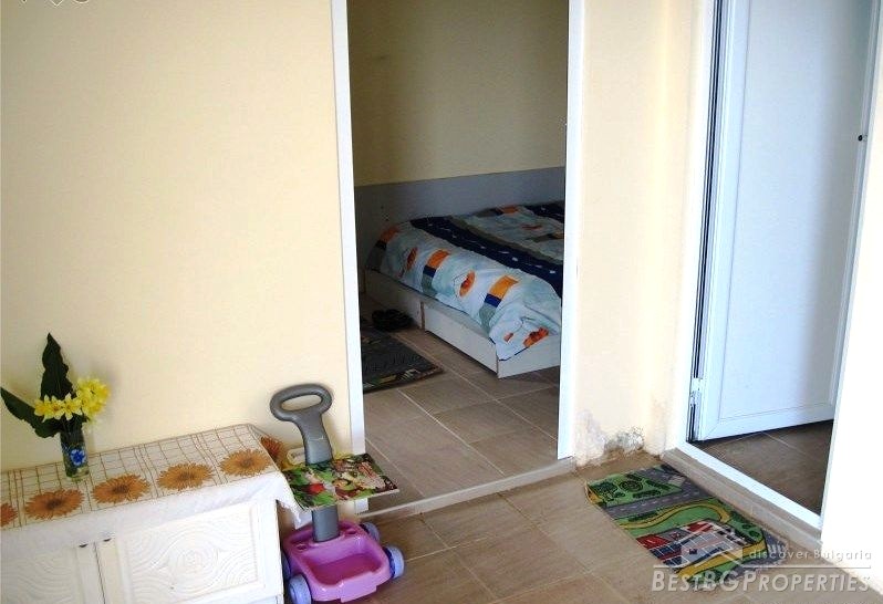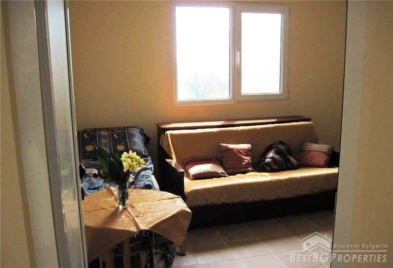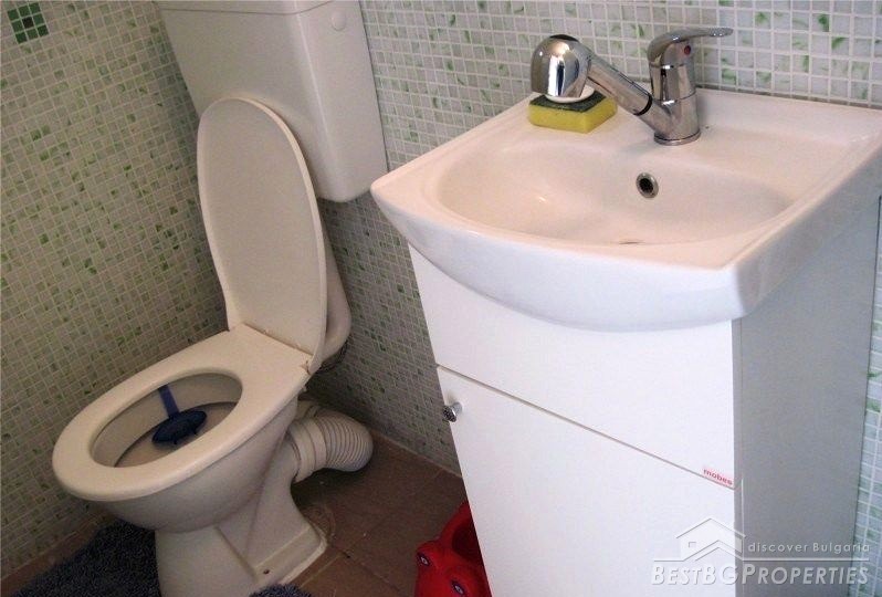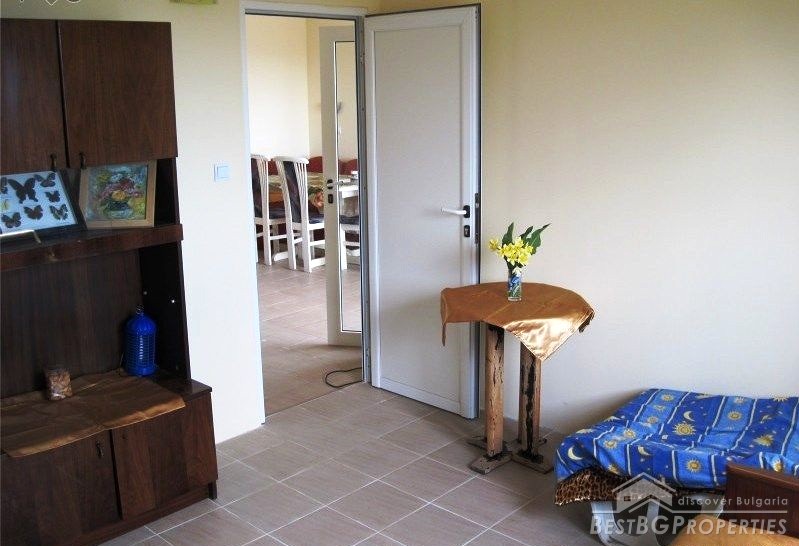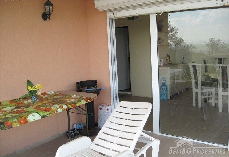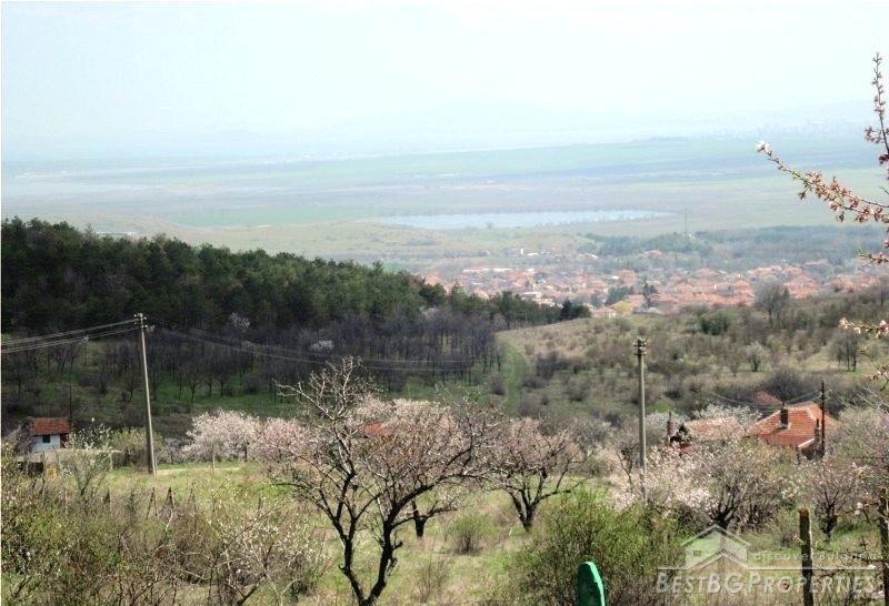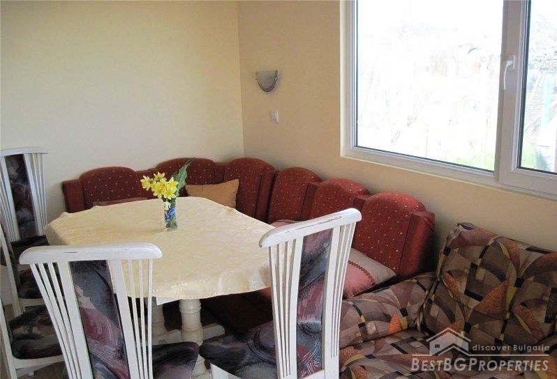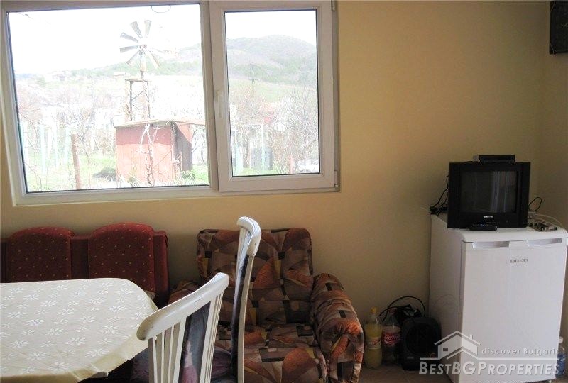The yard is large enough for building a swimming pool and there are some sun loungers. The parcel is 510 sq m. The villa has spectacular views in all directions. On a clear day you can see as far as Pomorie and the sea. The property is located near a pine forest. It is 17 km. (20 min by car) from the sea.