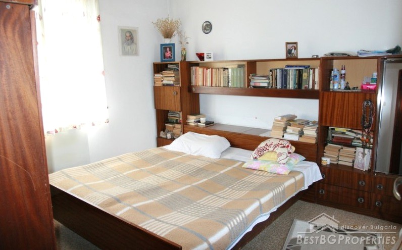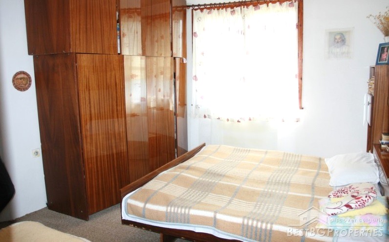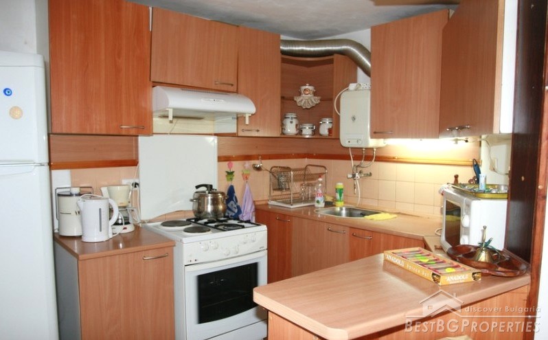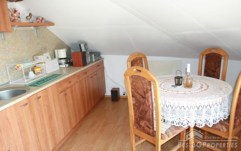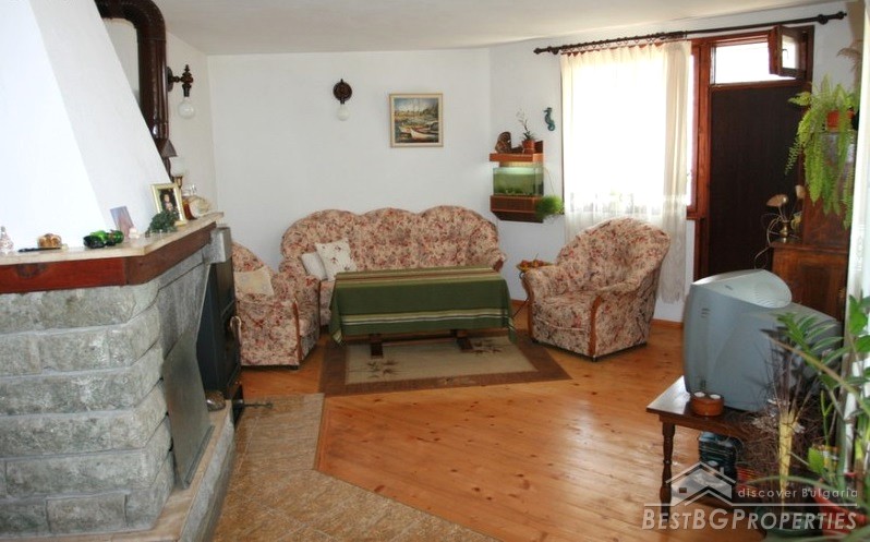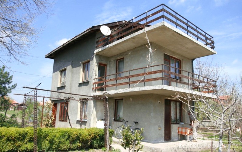 The house has three floors and total living area of 173 sq m. On the first floor there is a living room with dining on two levels, finished with wood and terracotta floors, WC, corridor, one room and inside stairs to the second floor. The second floor comprises with three bedrooms, bathroom with WC, one glazed balcony and one open one. On the third floor there is a equipped kitchen, terrace with barbeque and three more incomplete premises.