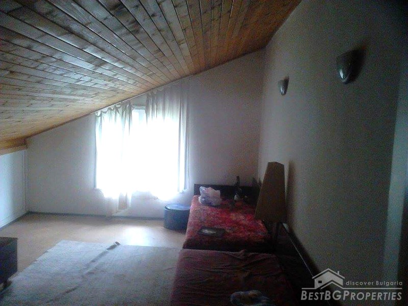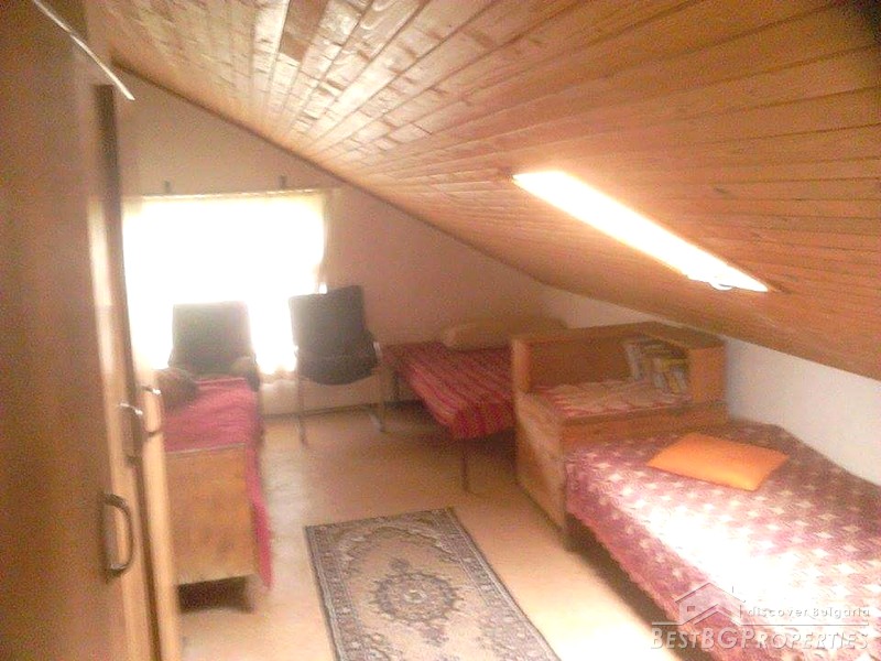 The house is two-storied, with additional attic floor. It has built area of 120 sq m and a yard of 810 sq m. The distribution of the premises inside is as follows: first floor – living room with kitchen box, one room, bathroom with WC and a closet. On the second floor there is a living room, two bedrooms, bathroom with WC. The attic floor comprises of two large rooms
