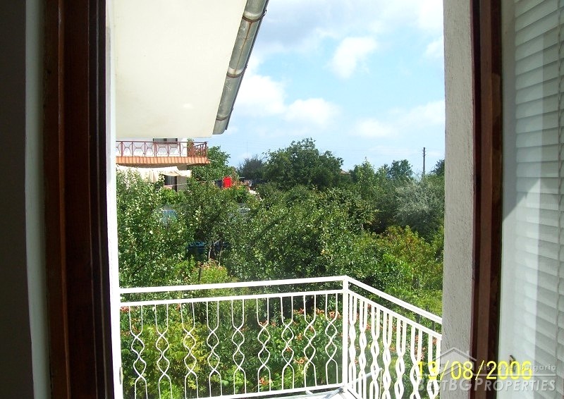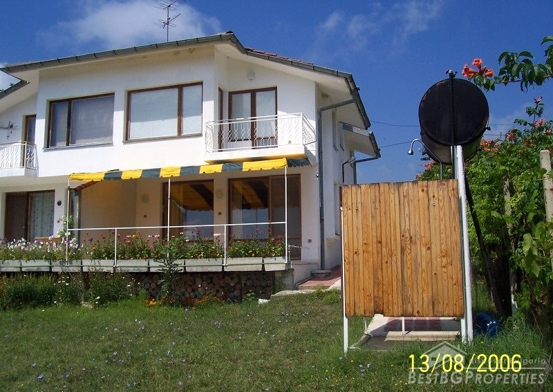 The house is a twin type divided on two equal shares with separate entrances and only one of the halves is for sale. It is on two floors and comprises total living area of 120 sq m. The yard that belongs to the property has total size of 450 sq m. The house is for sale completely finished and furnished. It has two bathrooms with WCs and one summer bathroom. The living area is distributed between a large living room with fireplace, kitchen, bathroom on the first floor and three bedrooms and a bathroom on the second floor. There is also a balcony on the second floor and a verandah on the first, with nice view over the sea.