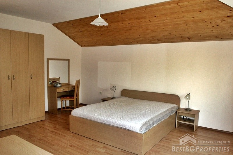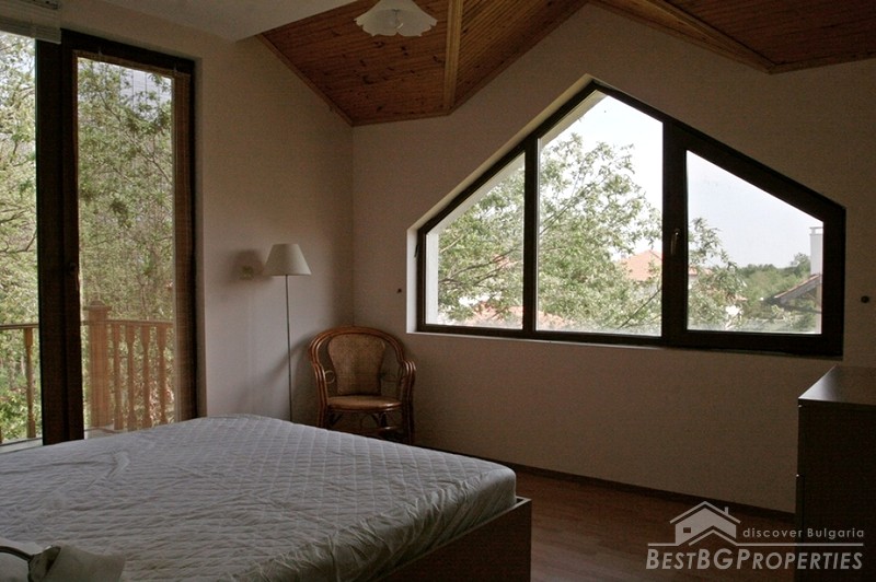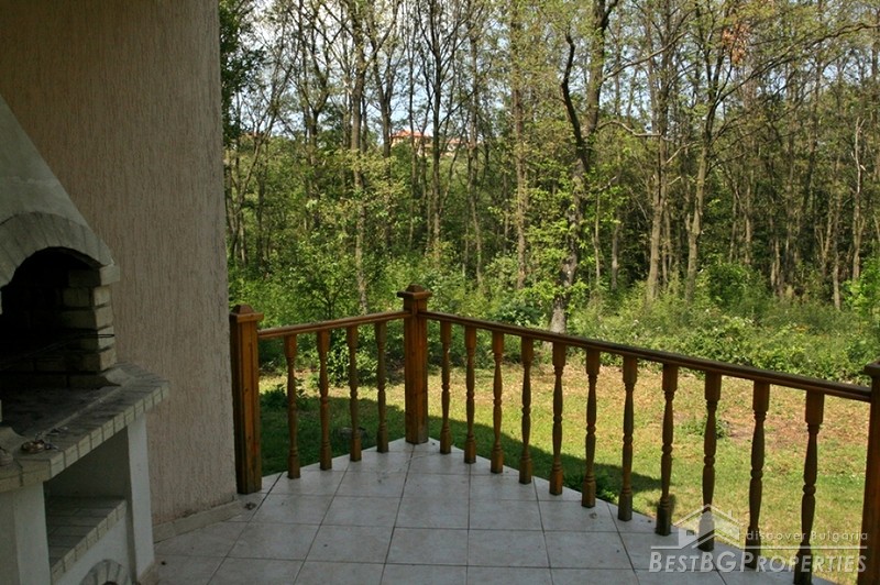 The house is two-storied and has the following distribution of the premises inside: On the first floor there is a living room, dining area with kitchen, one bedroom, bathroom with WC, corridor, closet, and a verandah with barbecue. On the second floor there are two bedrooms, bathroom, hallway and a balcony.