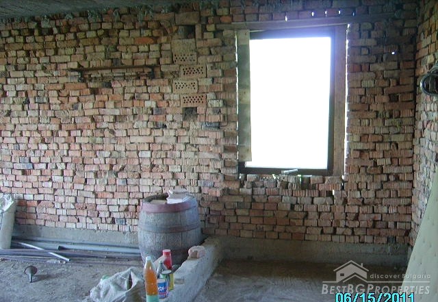 As you can see on the photos the house is not entirely finished. It is brick built, on two floors with a large basement. The distribution of the premises inside is as follows: On the first floor there two rooms and a large garage that can be converted into a large living room. In the garage there are the stairs to the second floor. The second floor has two rooms and a large living room with kitchen and a balcony.