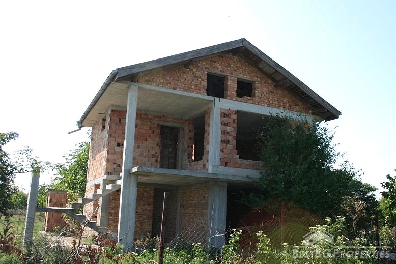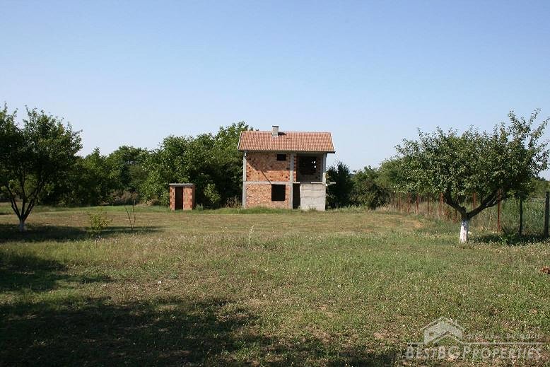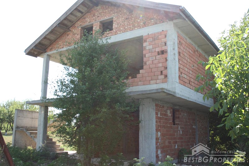 The house which is for sale is not yet finished. It is for sale on rough stage of completion, thus the price is so low. The house is made entirely out of brick and reinforced concrete. The roof is covered with "Bramac" tiles. The house consists of four rooms, kitchen, bathroom with WC, balcony and an attic. The house is built on a large plot - 1200 sq m in size. The plot is totally flat, nicely arranged with many fruit trees, and other greenery. The plot is surrounded by all sides by a wire fence.