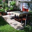 The yard is perfectly cultivated. There are different fruit trees and other plants.