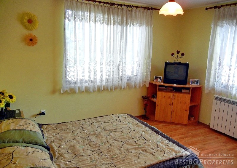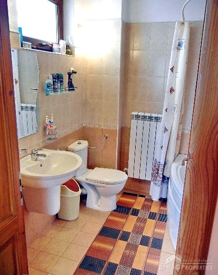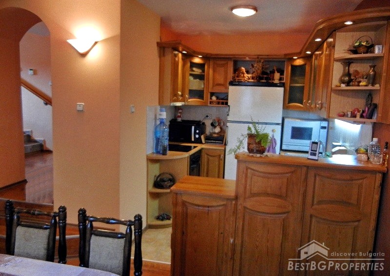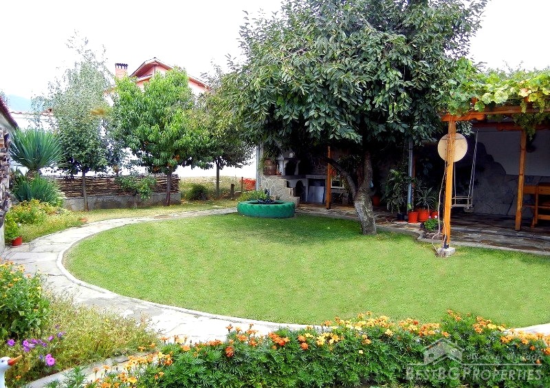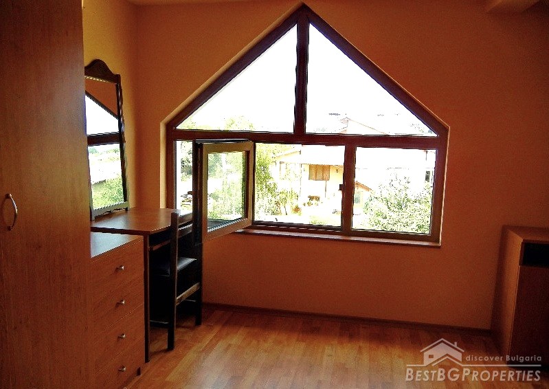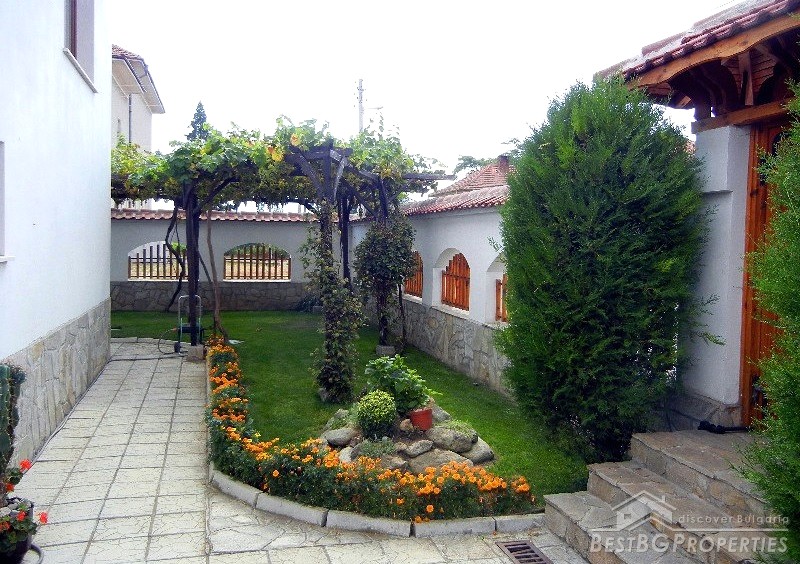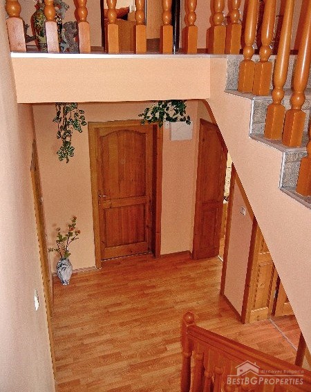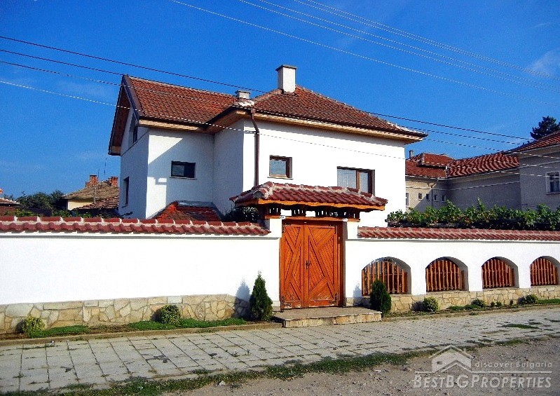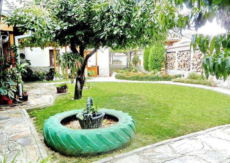 The security of the building, the garage and the storage room is guaranteed by a security system. The house is insulated, has 5 chamber PVC windows "Golden Oak". The flooring throughout the house is laminate. The heating is via aluminum radiators on both floors and a boiler on combination of wood and coal. There is also a separate system for heating water through solar panels located on the roof. The water supply to the house and the yard is via a 12 meters probe with hydrophobic system.