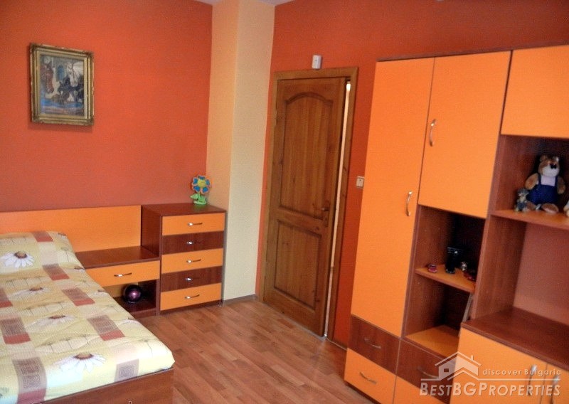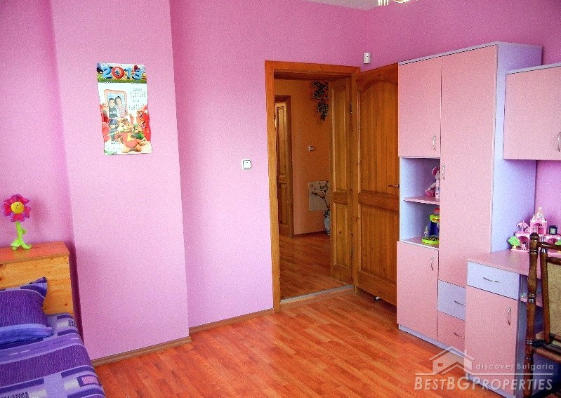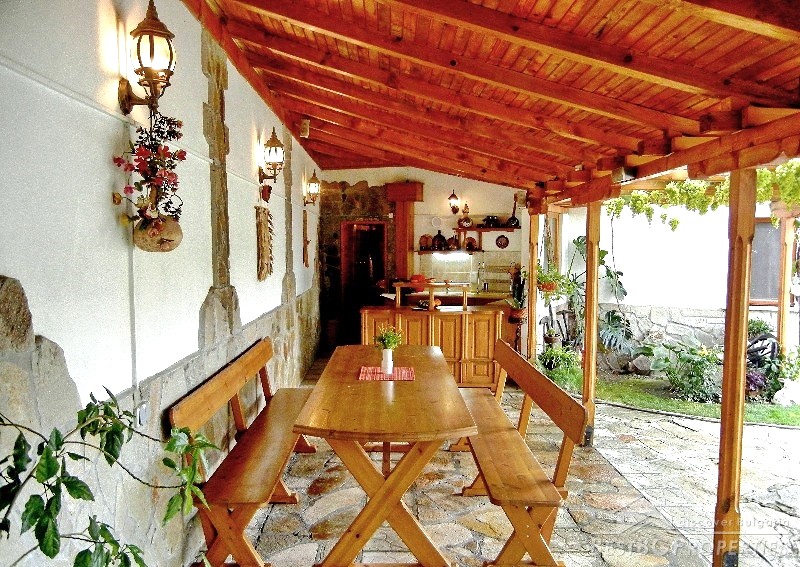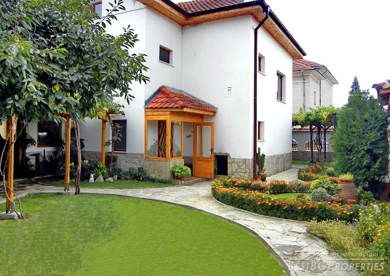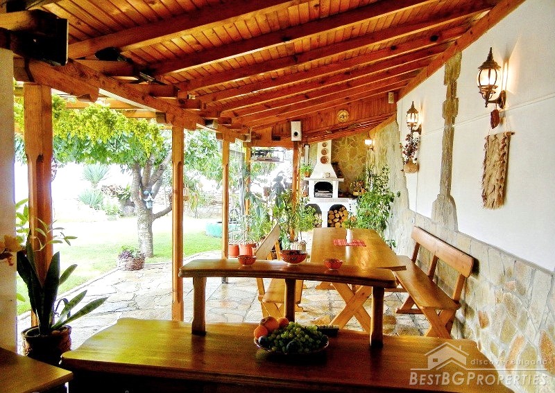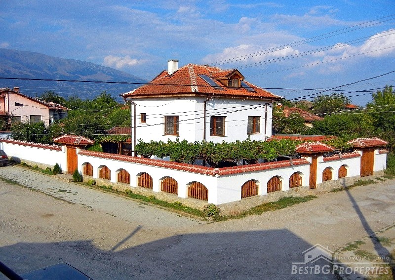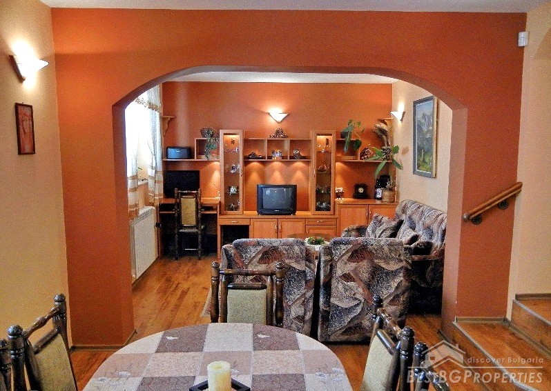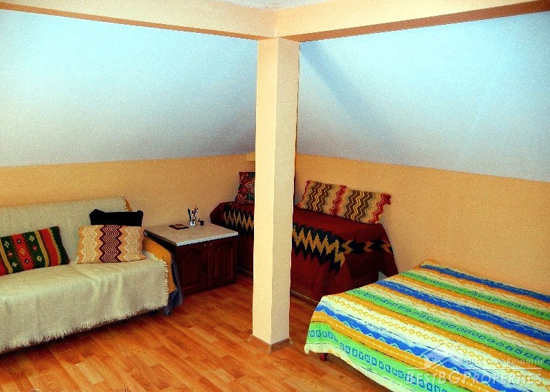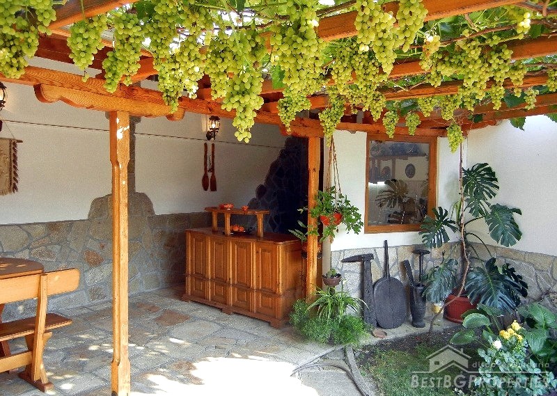The security of the building, the garage and the storage room is guaranteed by a security system. The house is insulated, has 5 chamber PVC windows "Golden Oak". The flooring throughout the house is laminate. The heating is via aluminum radiators on both floors and a boiler on combination of wood and coal. There is also a separate system for heating water through solar panels located on the roof. The water supply to the house and the yard is via a 12 meters probe with hydrophobic system.