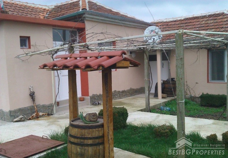 The yard is landscaped, with grass, shrubs and flowers in front of the house, and fruit trees and a small vineyard behind it. The house has roof isolation under the tiles and 5 cm outside isolation. There are plastic window joineries, metal doors outside and wooden doors inside the house. There are new water, sewerage and electrical installations.