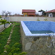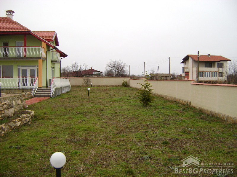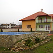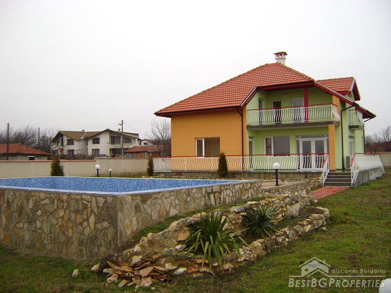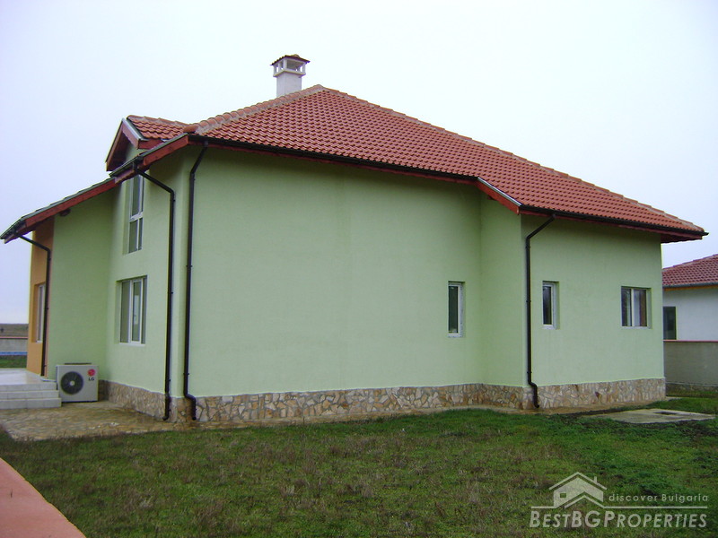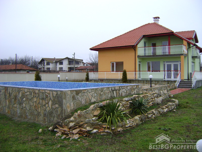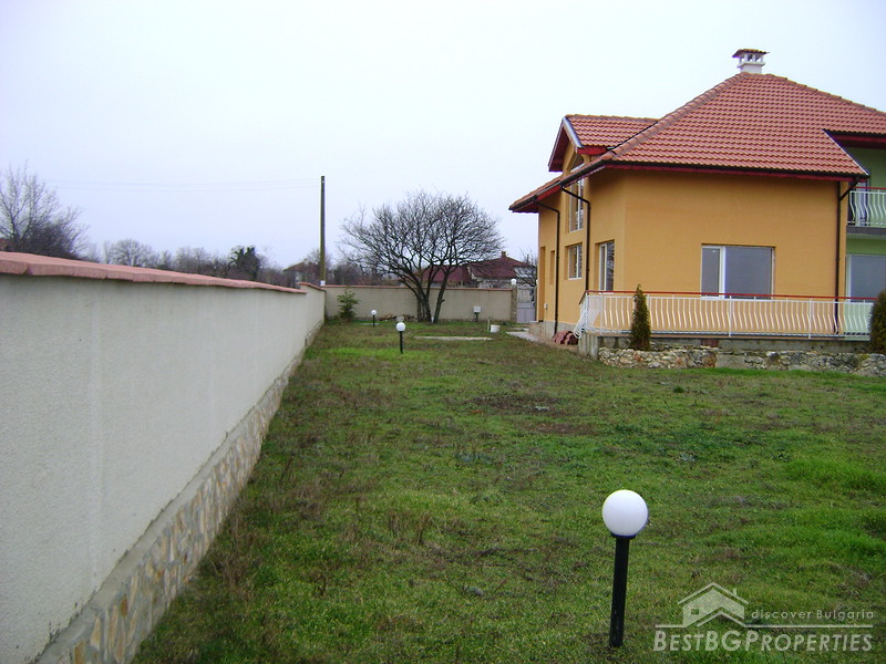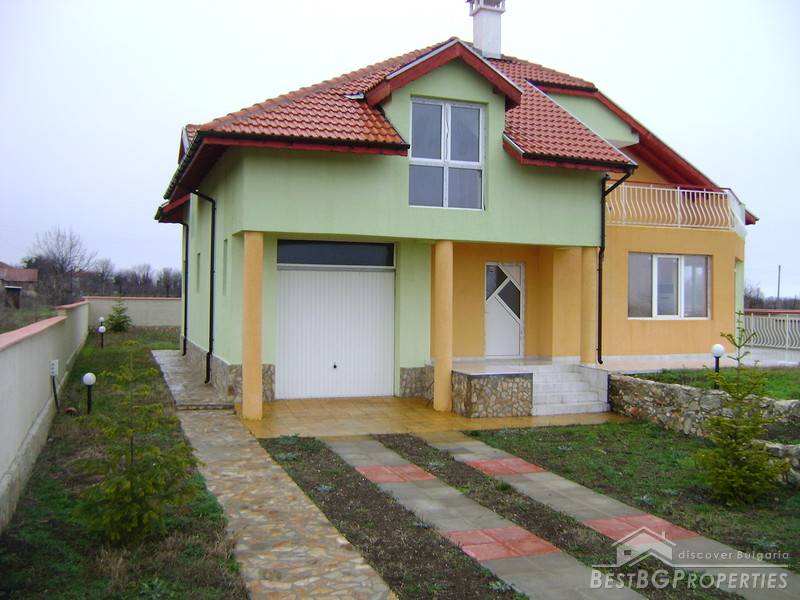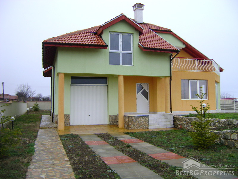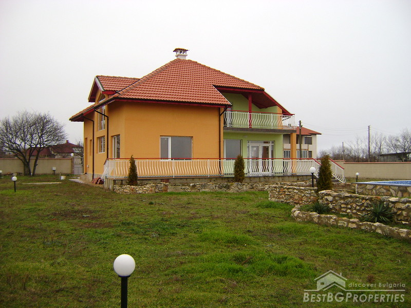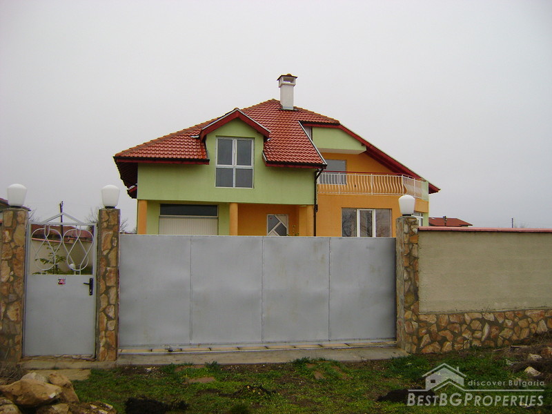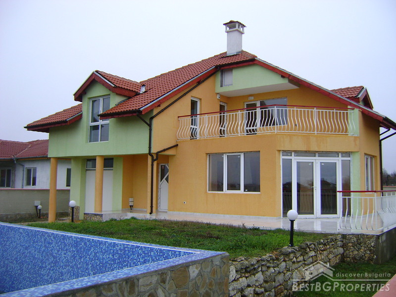 This is an outstanding house located only 800 m from the sea in a quiet village on the north of the Bulgarian Sea side close to the Romanian border. The house has an interesting design painted in two different colors. It has 2 stores with 260 sq m total living area. The plot is large, 900 sq m in size. It is well maintained with beautifully landscaped garden with few small trees planted, lights installed and a pool. The house consists of 3 bedrooms 3 bathrooms with WC, a dining room, kitchen and a garage. There is a balcony on the second floor. The windows and doors are with PVC frames. The roof is covered with red tales. The garage door is automatic. Every room is air-conditioned. The whole property is surrounded with a massive fence. From the windows and the balcony opens splendid view.