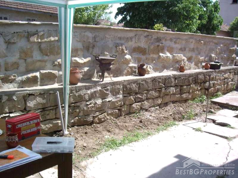 The yard is 700 sq m. In it there is a barn with area 30 sq m which consists of one room, a shed and a toilet. The parcel is flat and fenced. It is separated from the street with a stone wall.