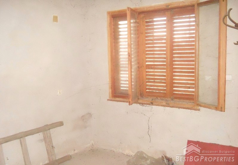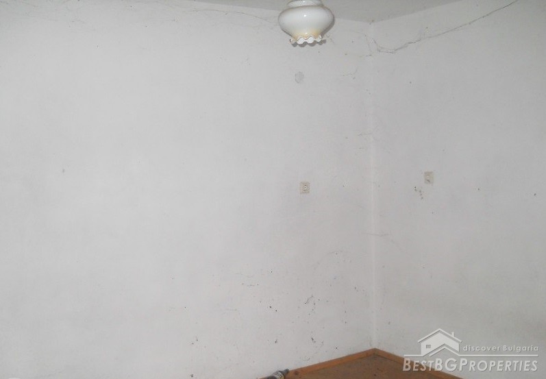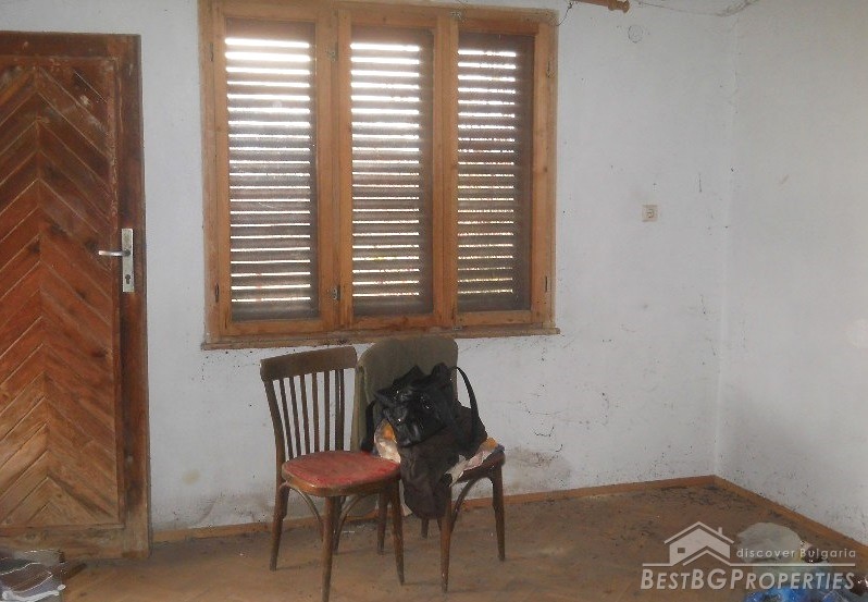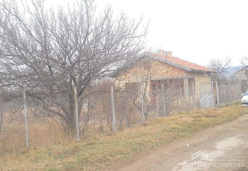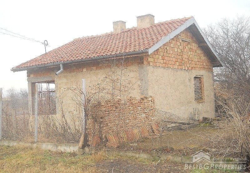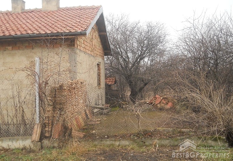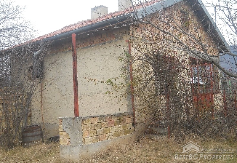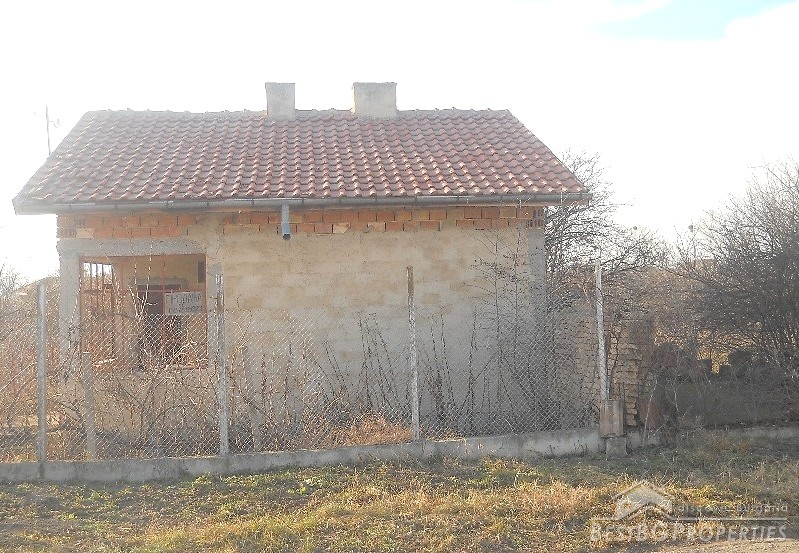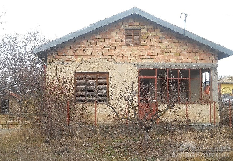 The house has built area of 50 sq m. It is not finished and sold as it is. The building consists of an entrance hall, two rooms, kitchen and bathroom + attic premise. Adjacent to the house at its northern side there is a concrete basement of 20 sq m above which there is a permit for building a garage. At the eastern side of the house there is a permit for building another additional room and at the southern part there are foundations for a barbeque and outside tap. The yard is 1800 sq m.