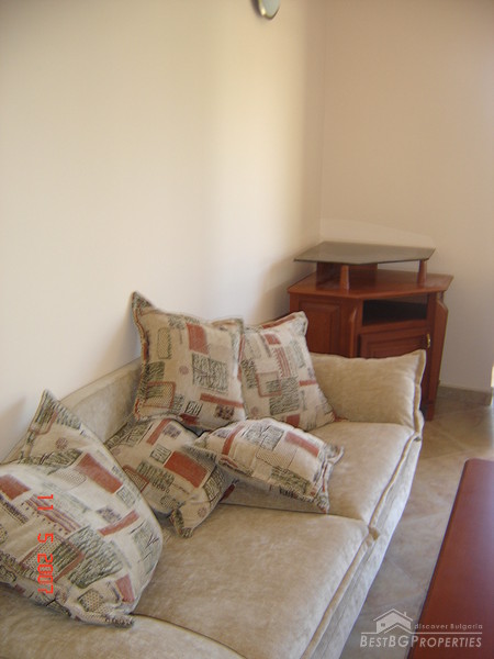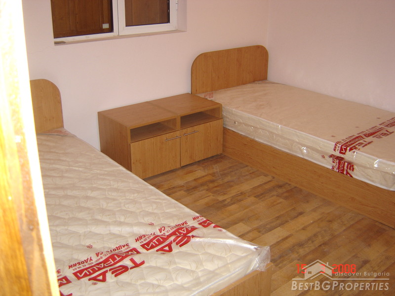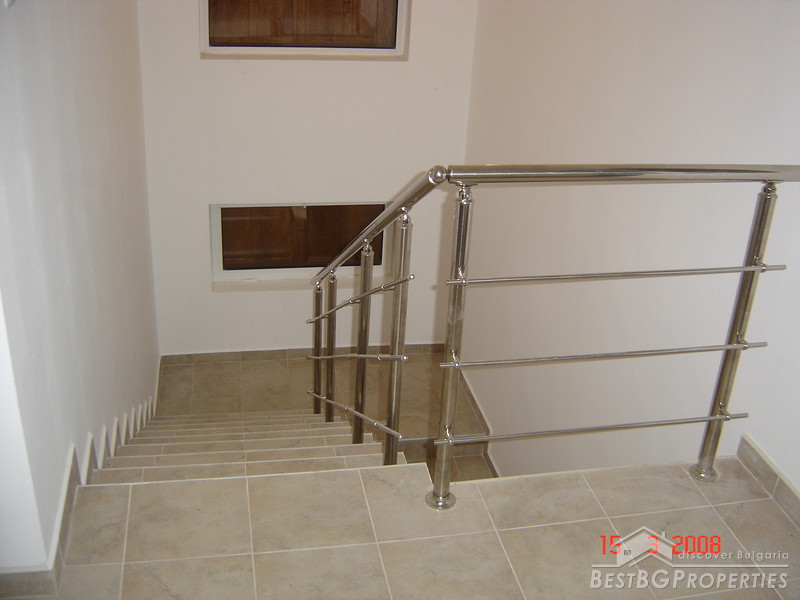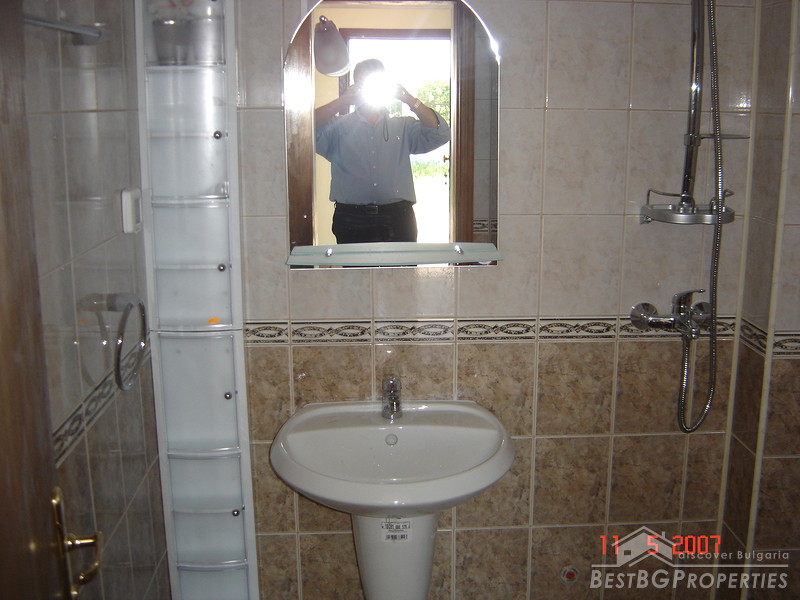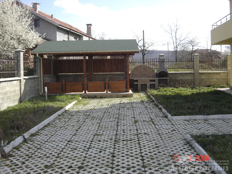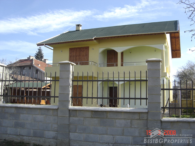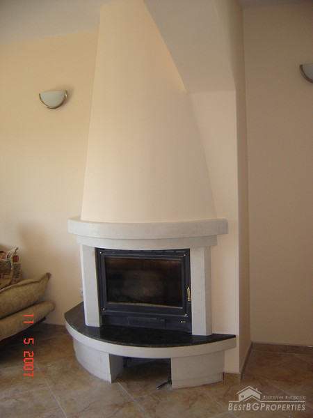 The house is two storey and has built area of 84 sq m. The total living area is 180 sq m. The building is solid concrete construction. The roof is reinforced concrete with isolation. The house has French fireplace, PVC windows with wooden shutters, full furnishing – living room, kitchen, bedrooms and WC.