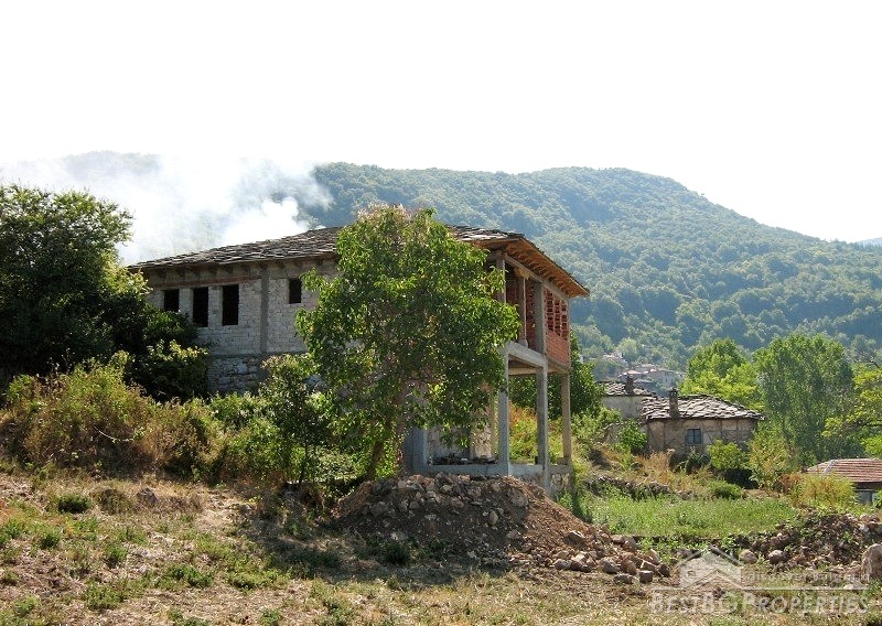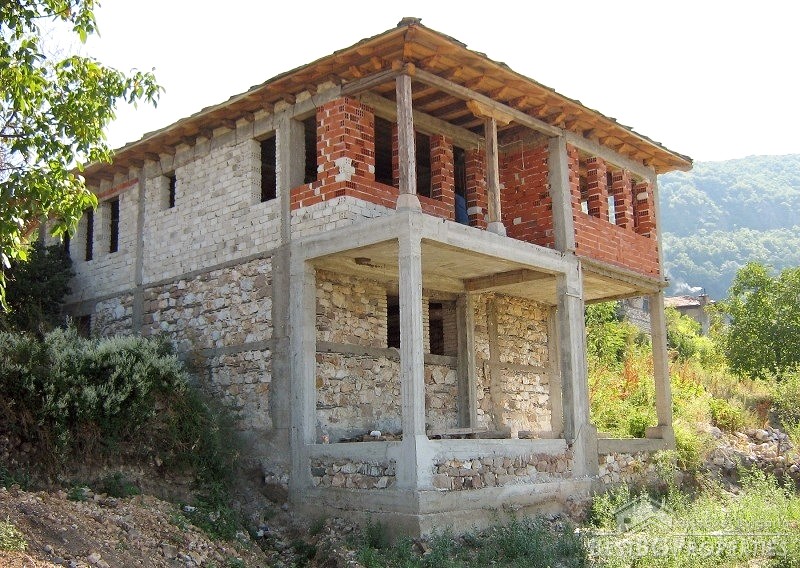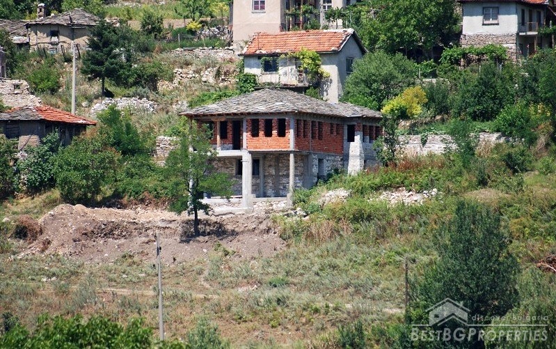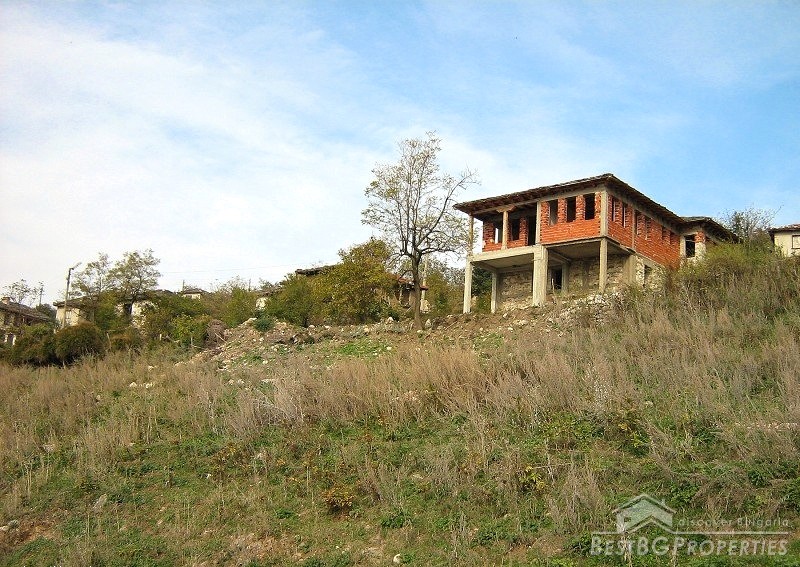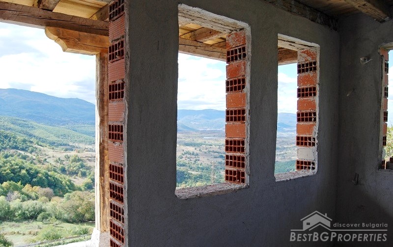 The property consists of an incomplete two-story house and a spacious yard. The house is finished on rough stage of completion - walls and roof, no window joineries or isolation and plaster. It has concrete and stone foundations, stone built first floor, and brick built second one. The roof is wooden. The house is very large and spacious having total living area of 200 sq m. The distribution of the premises is as fallows: the first floor consists of a spacious open plan premise (kitchen) and boiler room. The second floor has four bedrooms and four bathrooms. The yard is 500 sq m in size. The property is situated on a high hill with amazing panoramic view over the whole valley.