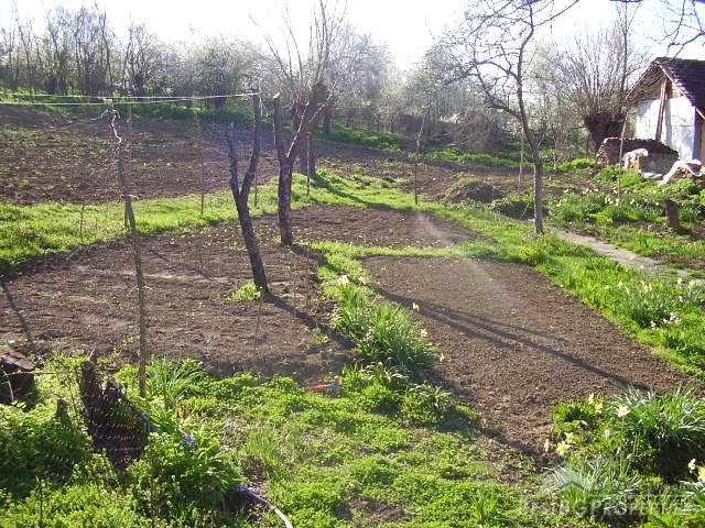 The house sits in a plot of land 2700 sq m in size and could be split. A new wall has been built to the front and to the side, the other boundaries are wire fenced. A small area has been put into gardens and lawns, the remainder is grass. There are a few fruit trees and a big walnut tree which shades the house from the sun during the summer. The house has good road access, mains water and electric.