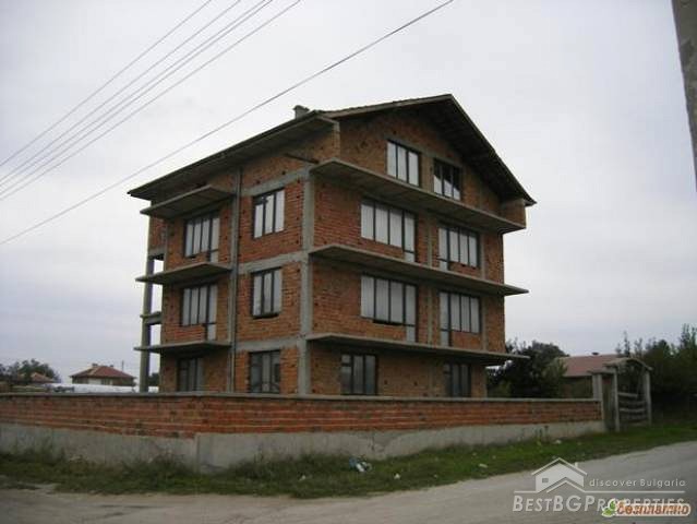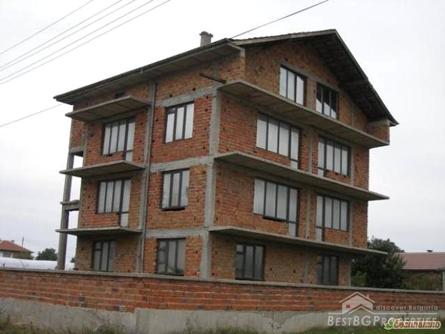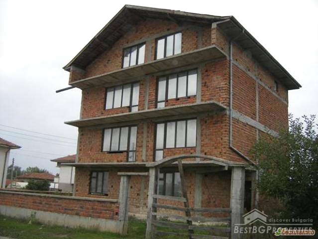 The property comprises a large newly built house and a spacious yard. The house is 4 storeys and is not yet finished. There are some finishing works left to be done. Including plastering from the outside, flooring and painting from the inside. It is on rough stage of completion right now. High quality AL window joinery and doors are installed. The house is built entirely out of brick and reinforced concrete. The roof is wooden covered with tiles. The building comprises total living area of 550 sq m. Each floor is 140 sq m large. Each floor consists of 2 bedrooms, spacious living room with kitchen box, corridor, bathroom with WC, and balconies with outstanding views towards the village.