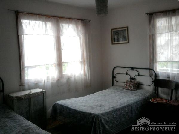 On the first floor there is a kitchen, internal bathroom and a living room. The kitchen is equipped with a new refrigerator with a separate camera, washing machine, oven and a new boiler. The heating is through a wood stove. Second floor has a separate outside entrance across the garage and inside entrance through the living room on the first floor. Both bedrooms have access to large balconies with railings. Both bedrooms are equipped with two beds. There is a closet in the east bedroom. The third floor consists of two rooms.