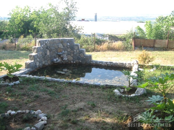The offered house is for sale without any furniture, but fully finished and ready to move in. It is two-storied with total living area of 100 sq m. It is built on a plot of land with size 800 sq m. The house is situated in the villa zone of the village in a quiet and calm area with amazing panorama over Plovdiv. The building consists of two bedrooms, kitchen, and bathroom with WC. In the yard there is a maintained cultivated garden, gazebo, swing and a fountain with pond.