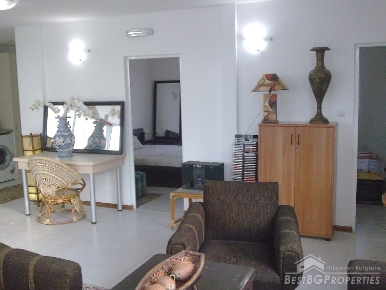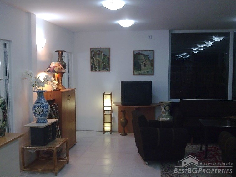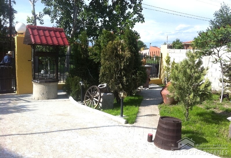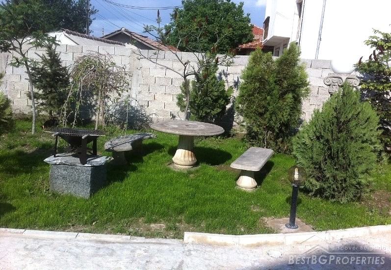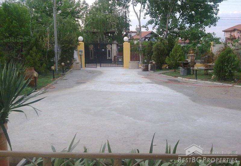 In front of the house there are lots of sculptures, statues and pine trees. There is garden lighting, paving, irrigation system with timer. At the back yard there are fruit trees. The plot is surrounded with wrought iron fence.