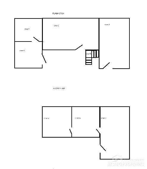 The house has total living area of 100 sq m and offers the following layout of the premises inside: On the first floor there is one room finished with stone and with concrete floor. The second room is brick finished, situated in the adjacent structure. There are two more rooms in another adjacent building which are meant to be used as a bathroom and WC. The second floor has three rooms with wooden floors.
