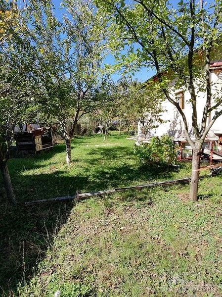 The yard is 550 sq m. It is slightly slopped, planted with fruit trees and flowers.