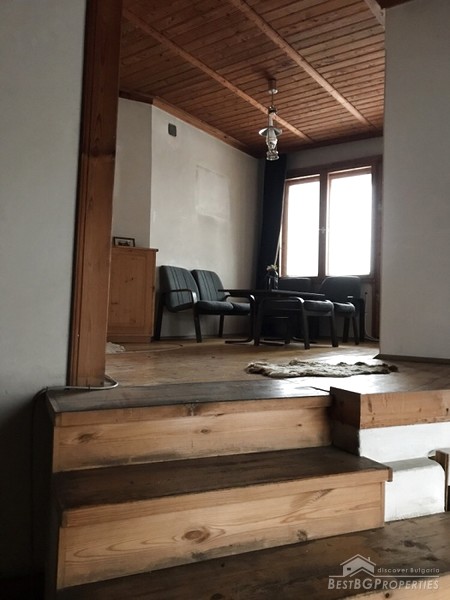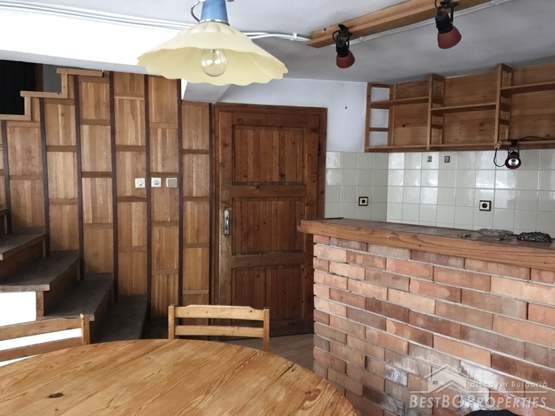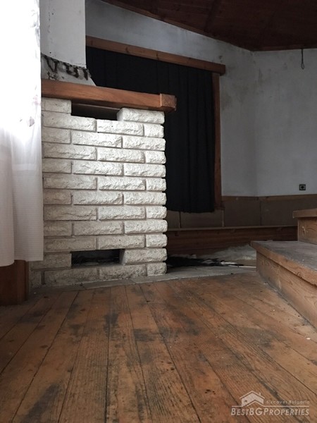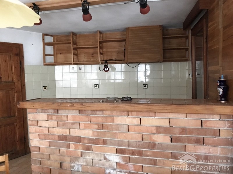 The distribution of the premises inside is on three levels. First level consists of a dining room, kitchen box, bathroom and a small entrance hall with access to the basement and the garage. The second level comprises of a living room with a fireplace, which opens onto a large veranda with a barbecue. The third level consists of two bedrooms.