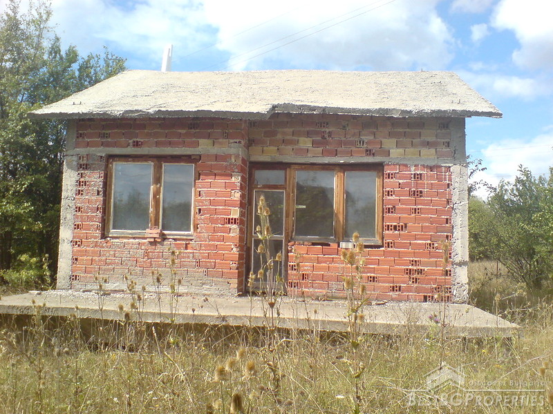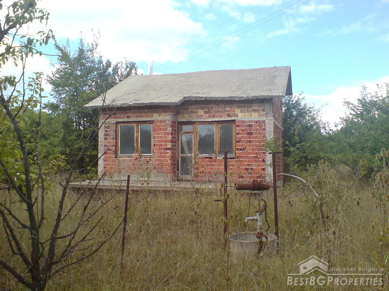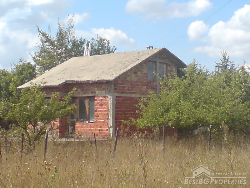 The house which is for sale is not yet completely finished. It comprises total living area of 92 sq m, spread among two residential floors. The first floor consists of a living room and a kitchen, bathroom and WC. The second floor has two rooms. The house is made out of brick. The roof is concrete. The house is not plastered and finished from the inside, thus the low price. It is built on a very large plot of land - 2600 sq m in size. The plot is nicely arranged with lots of greenery and fruit trees. The access to the property is by an asphalted road. There is water and electricity provided.