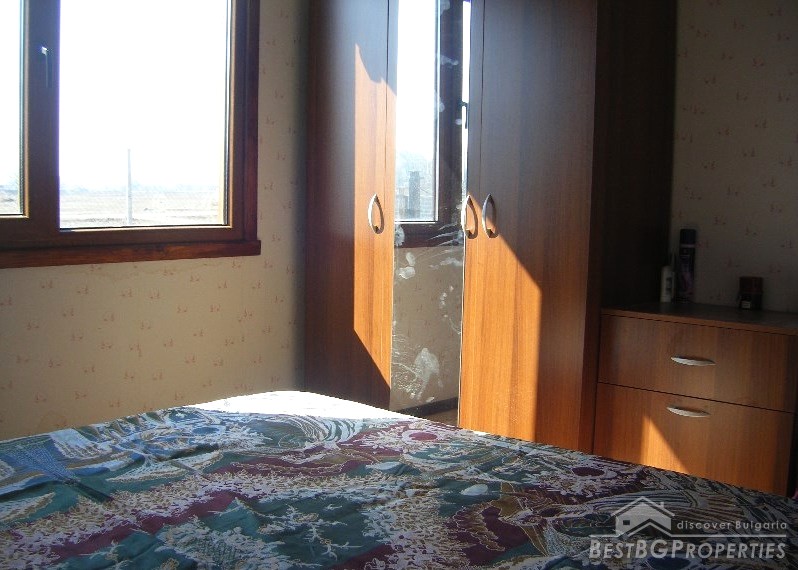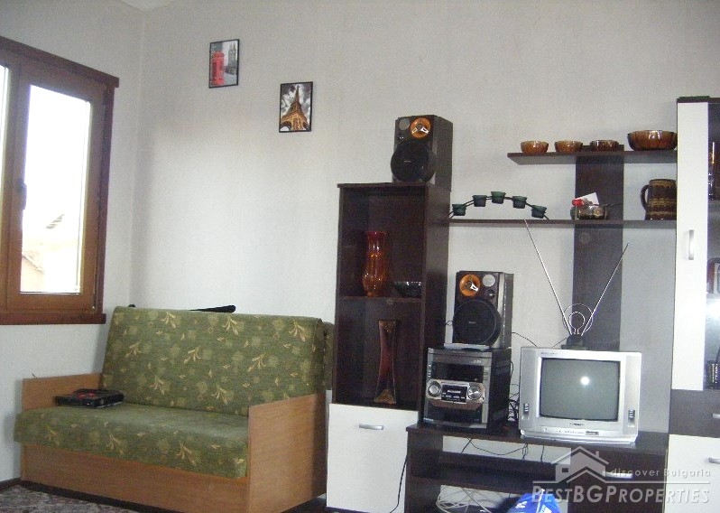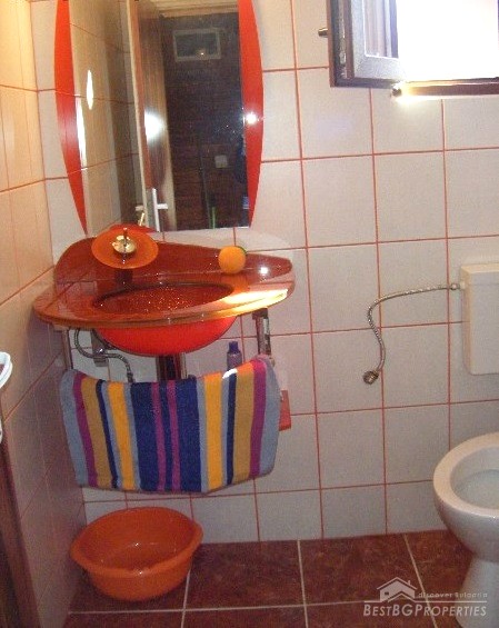 The inside finishing of the house is turnkey – terracotta, granite tiles, laminate and wooden flooring. The walls are finished with wallpapers and wood paneling. The distribution of the premises is as follows: two bedrooms, living room, kitchen, bathroom with WC, closet and a hallway.