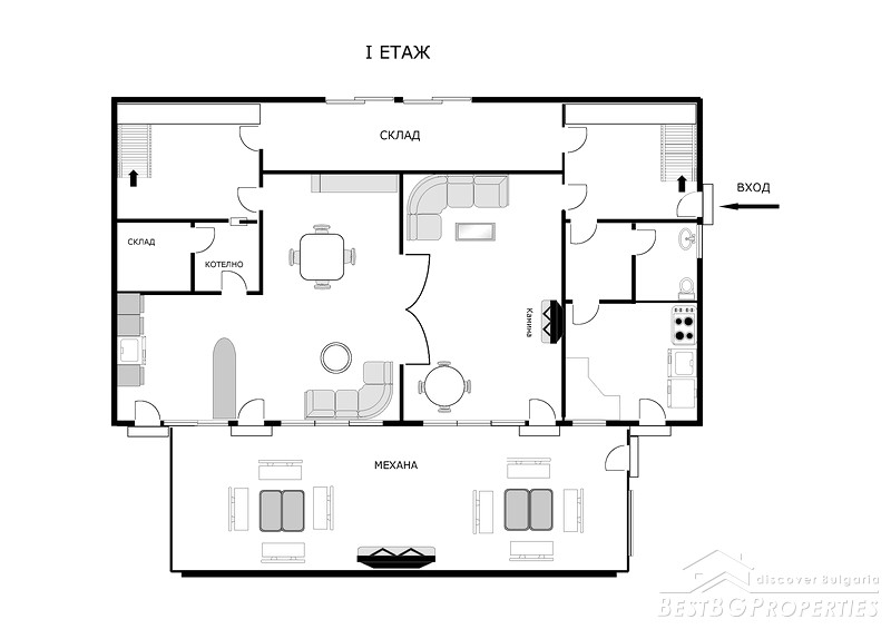 - First floor: Living room on two levels with fireplace, kitchenette and a separate kitchen, tavern with 20-30 seats, bathroom, boiler premise and a storage.