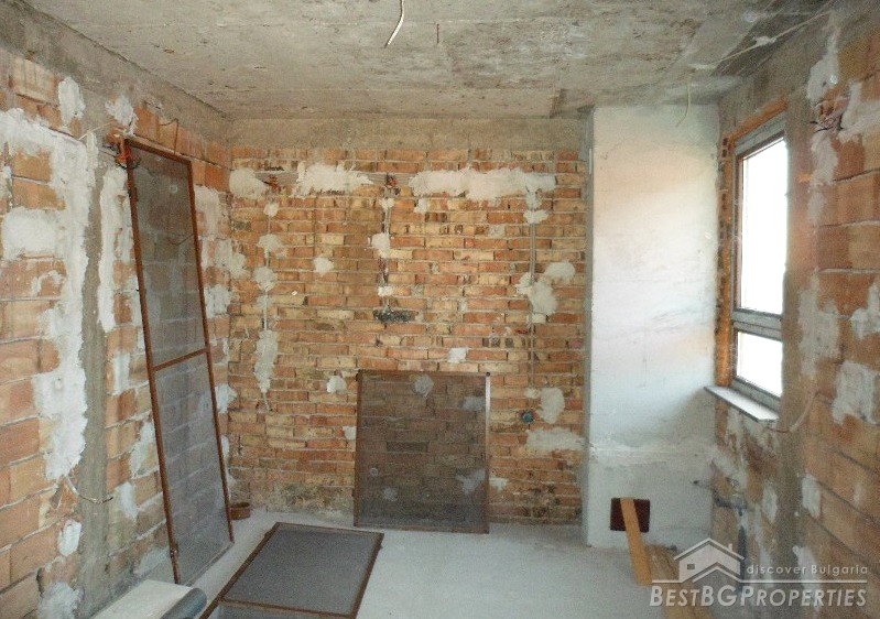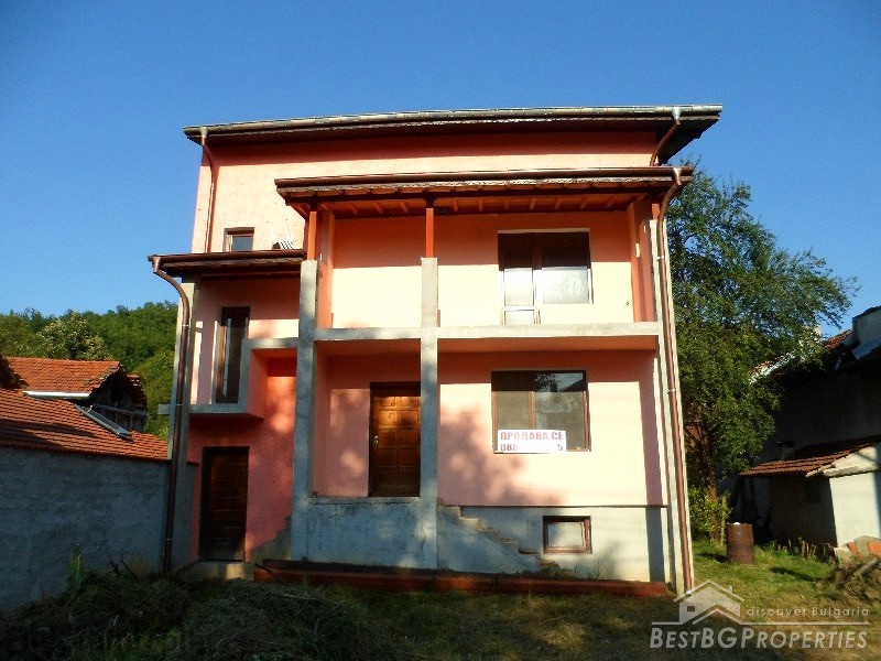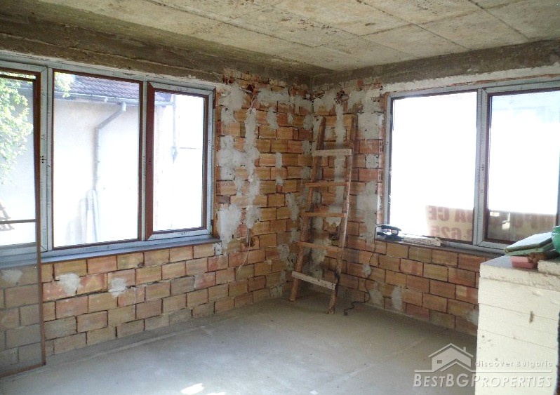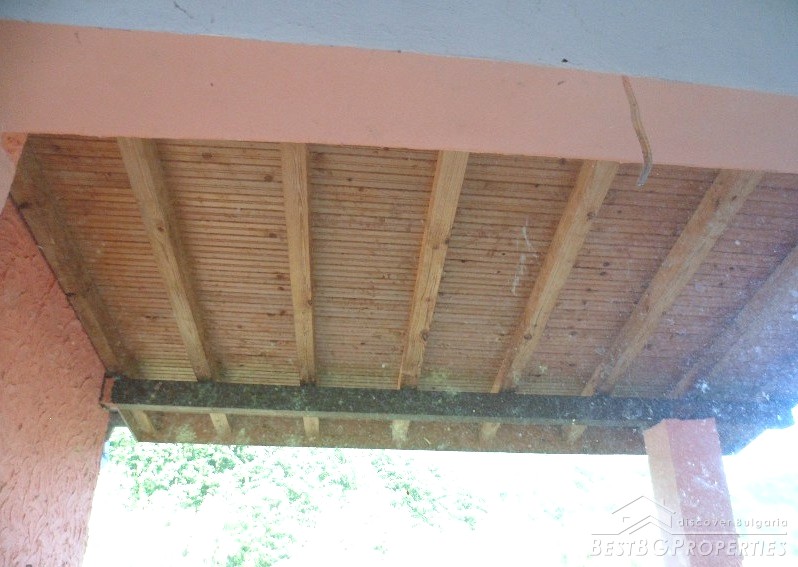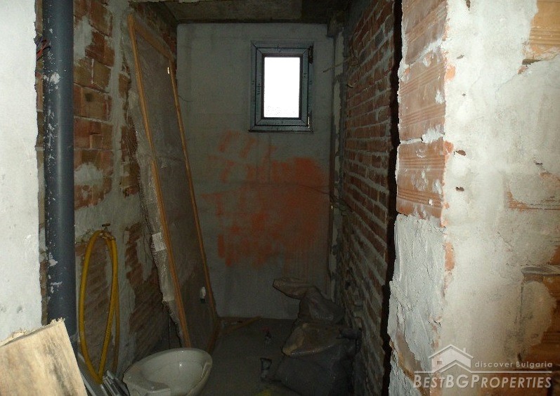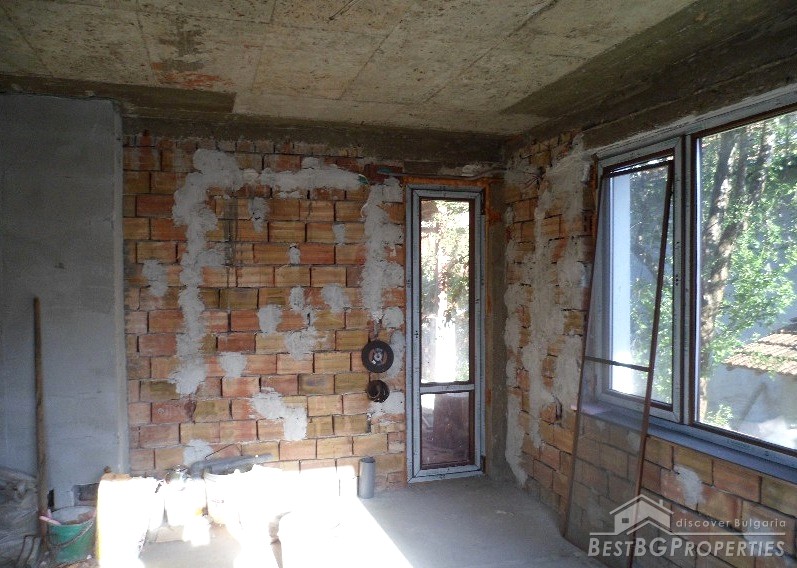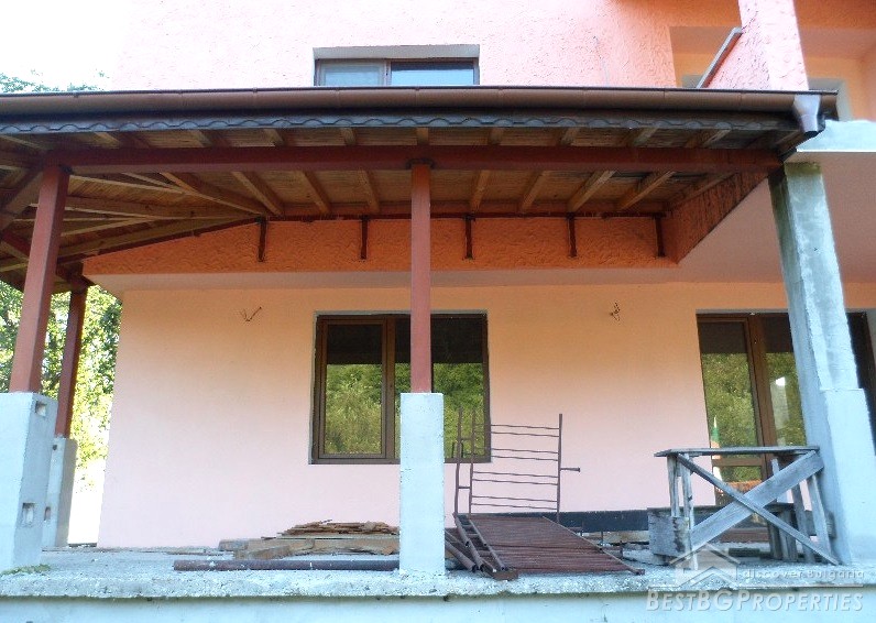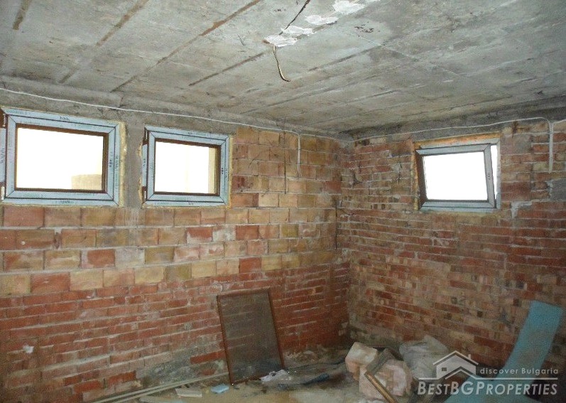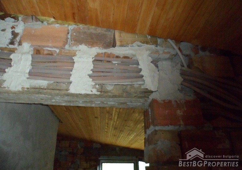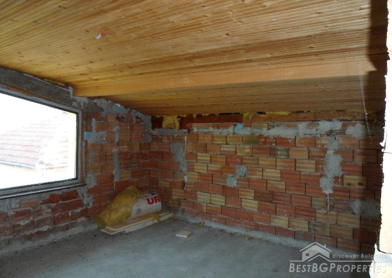 The house is newly built, plastered. It benefits with outside isolation and has three floors – 65 sq m each. There are three separated entrances to them. The third floor is used as a mansard and has slopped ceiling. The lowest part is with 1.7 m height. The window joinery is Salamander and the roof is completely new. The foundations and the basement are concrete.