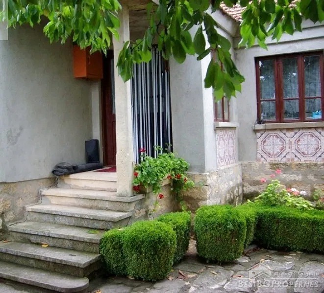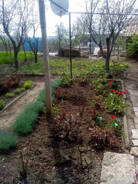 The property has an area of 1800 sq m. It has access from two streets. The garden is planted with flowers, fruit trees (cherries, apples, hazelnuts, asthma, walnut) and vines, and at the back of the house there are few additional outbuildings.