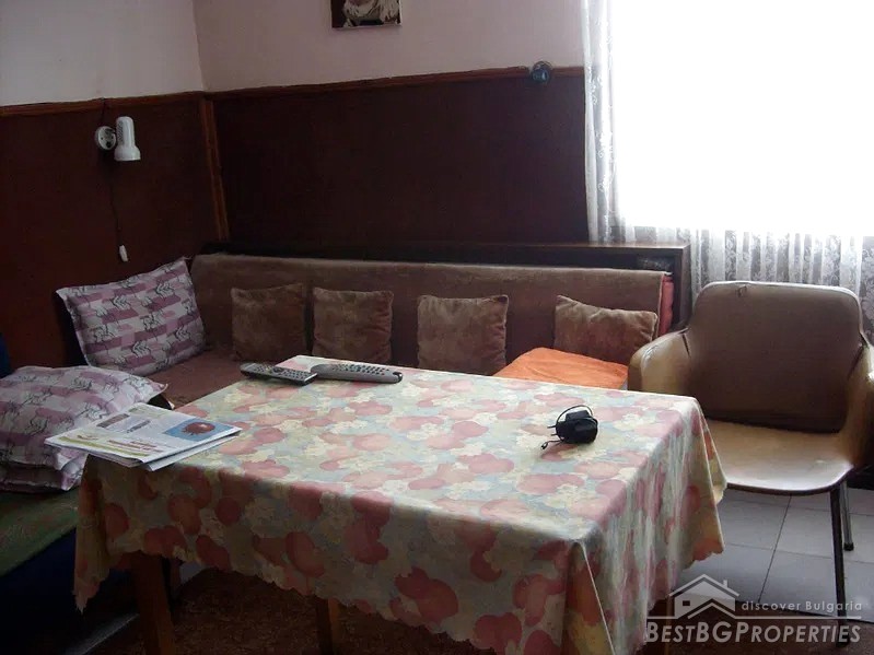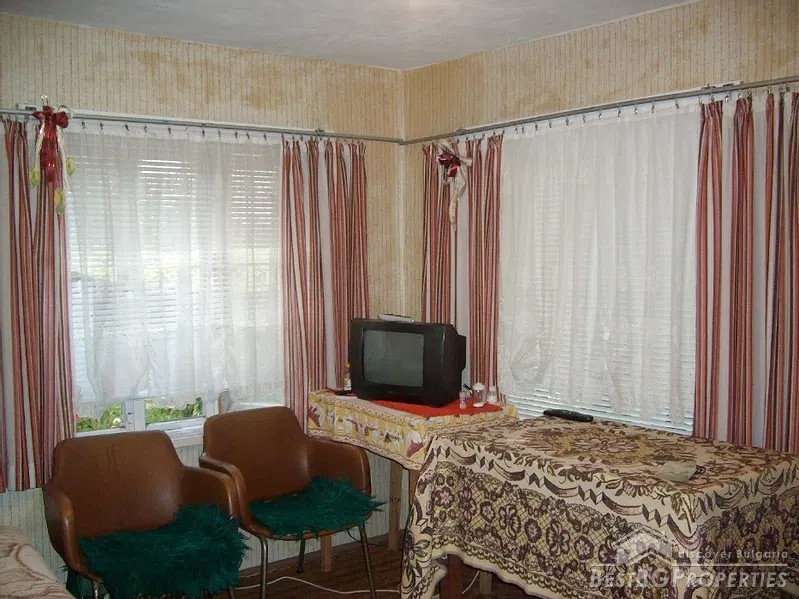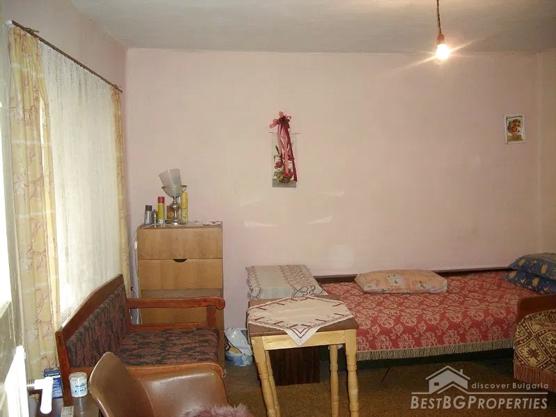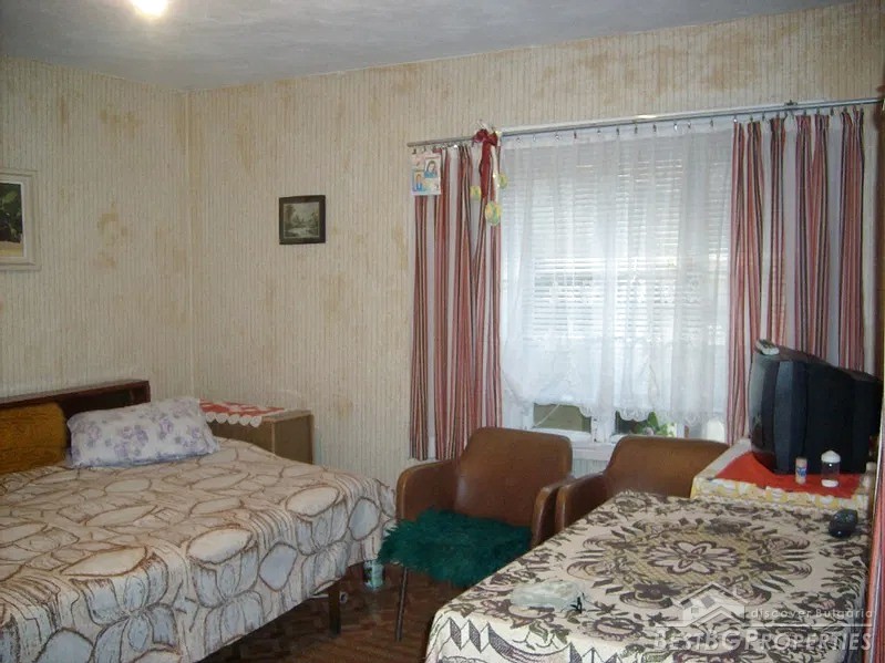 The house has an area of about 130 square meters and consists of two parts: The first part has a living room with kitchen, bathroom with toilet, and the second part has three bedrooms and an entrance hall. The house is old but in very good condition.